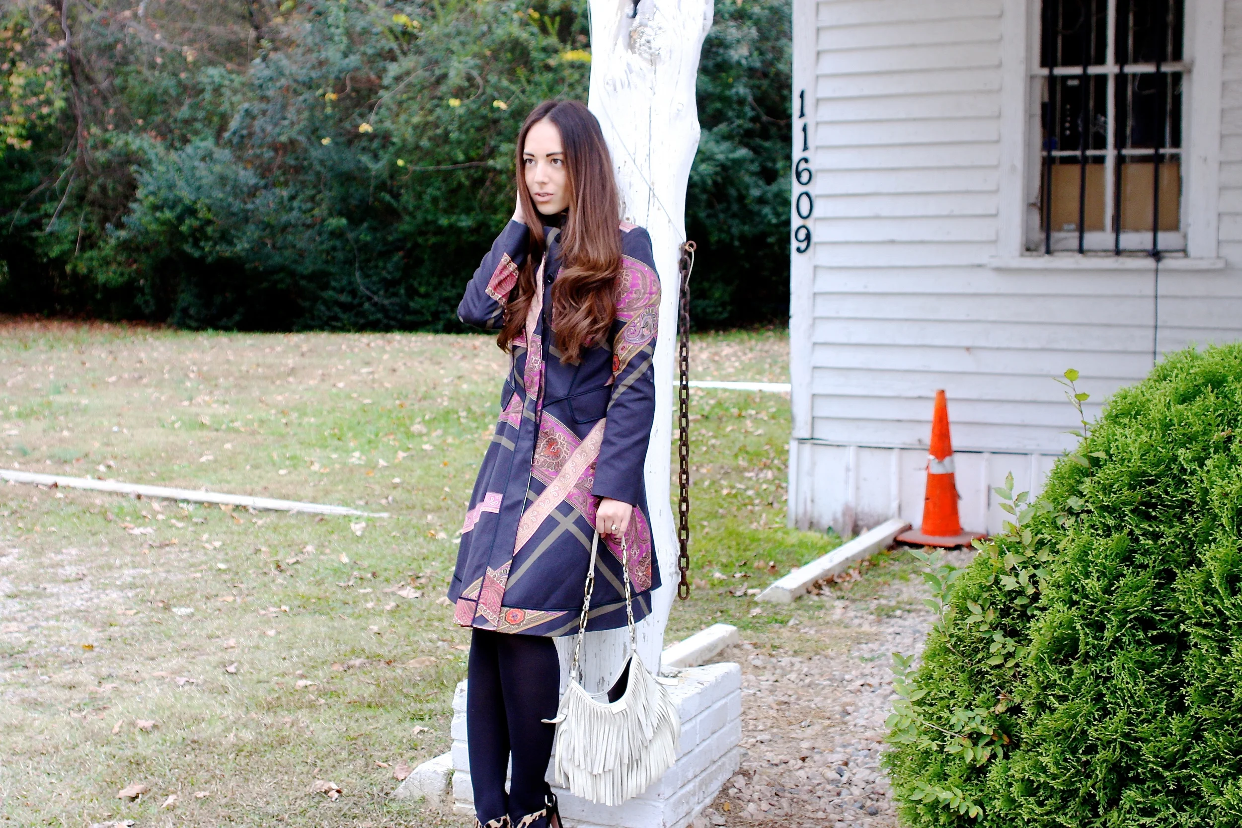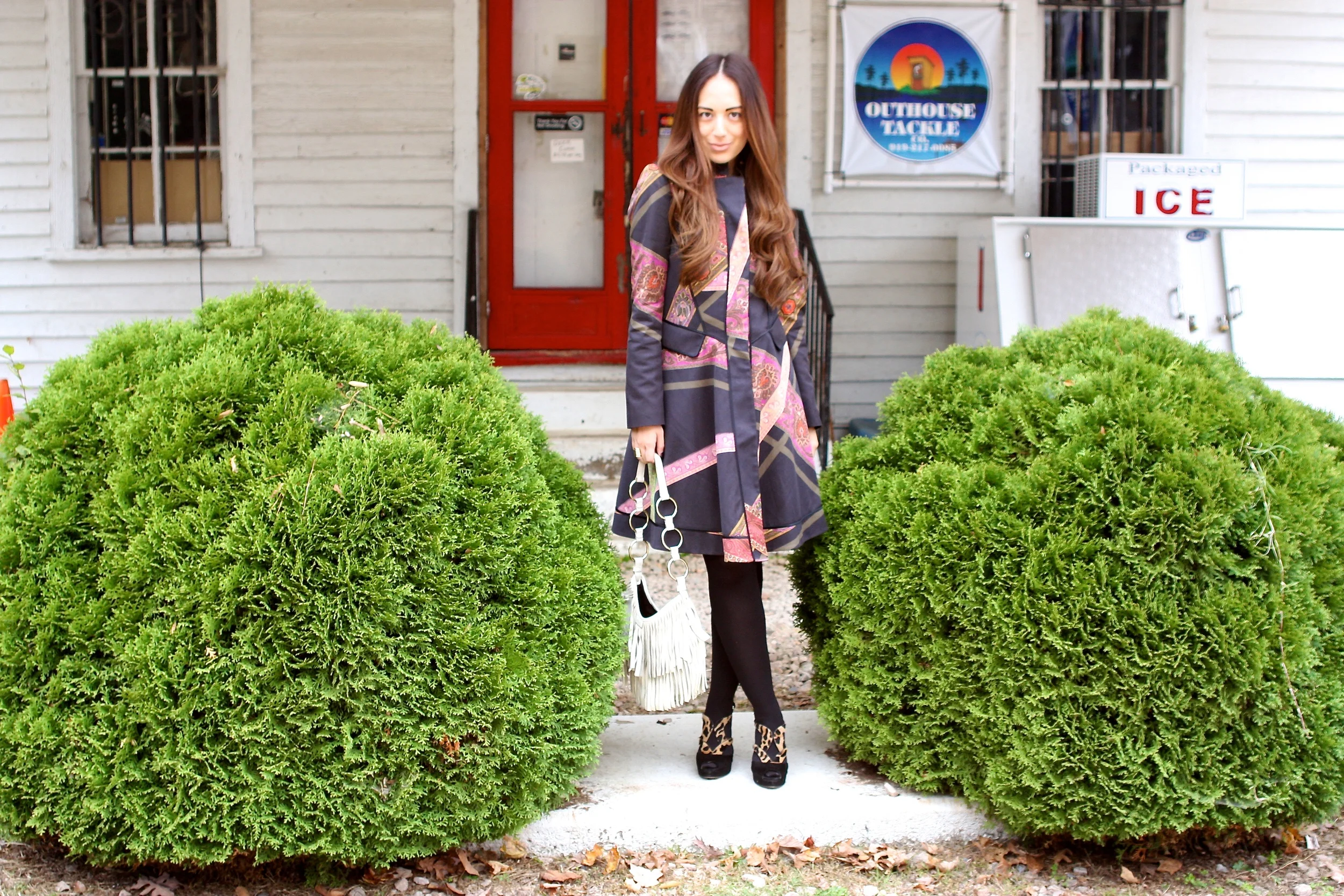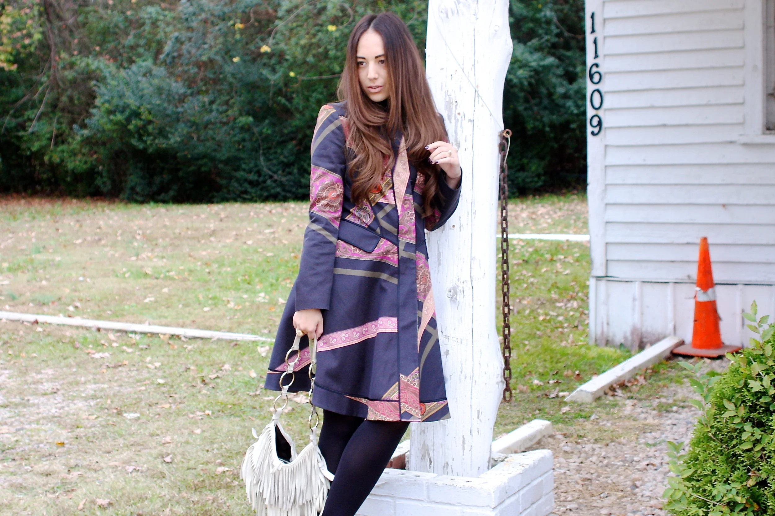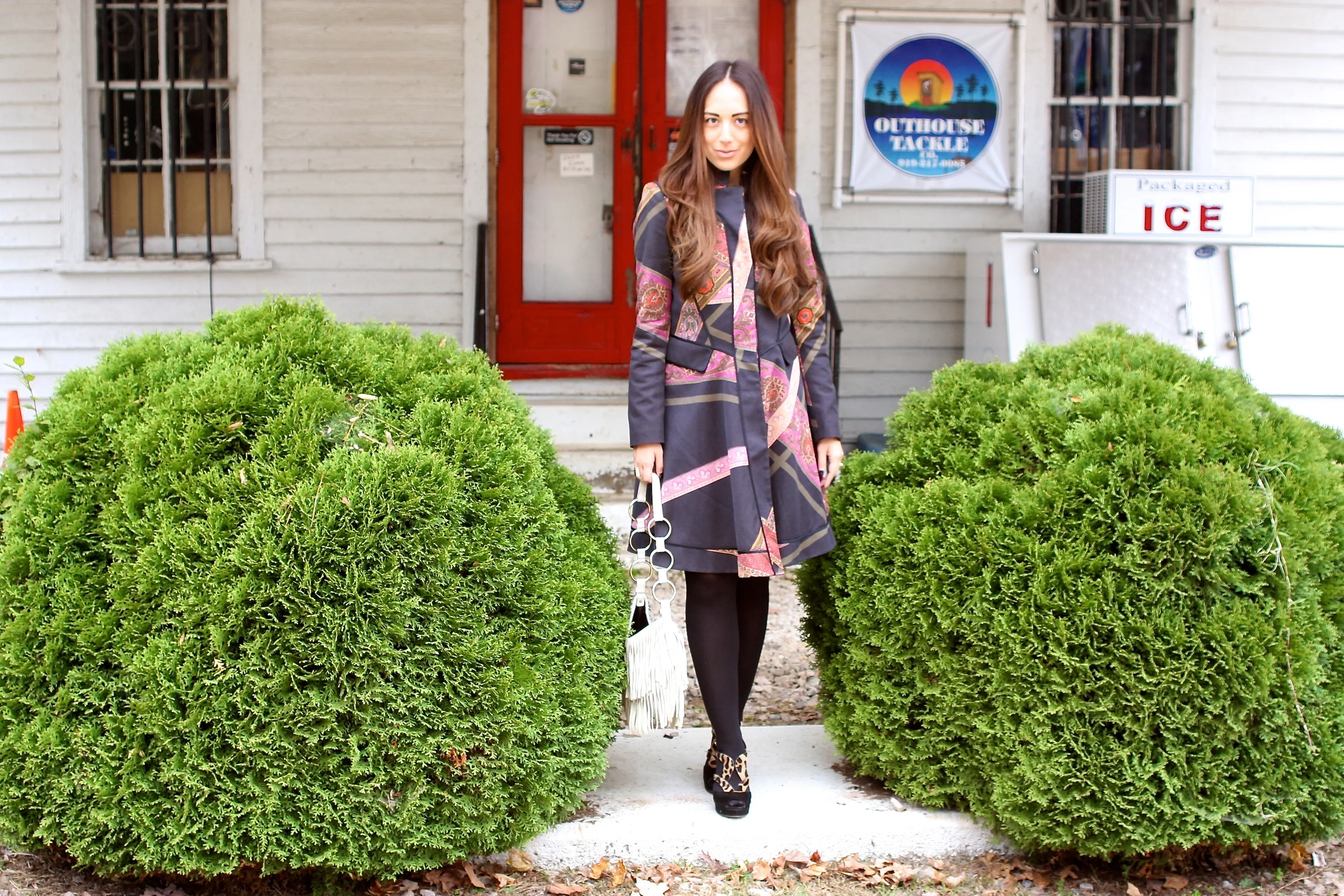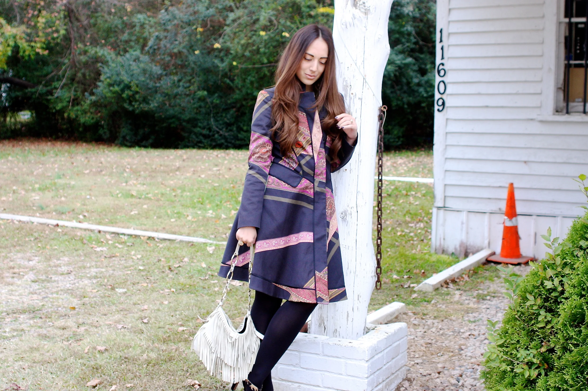 Coco wears an Isabel Marant Polka Dot Dress, Etro Paisley Swing Coat, Prada Leopard and Suede Sandals, Wolford Opaque 80 Tights, Saint Laurent Fringe Bag and Vintage Earrings.