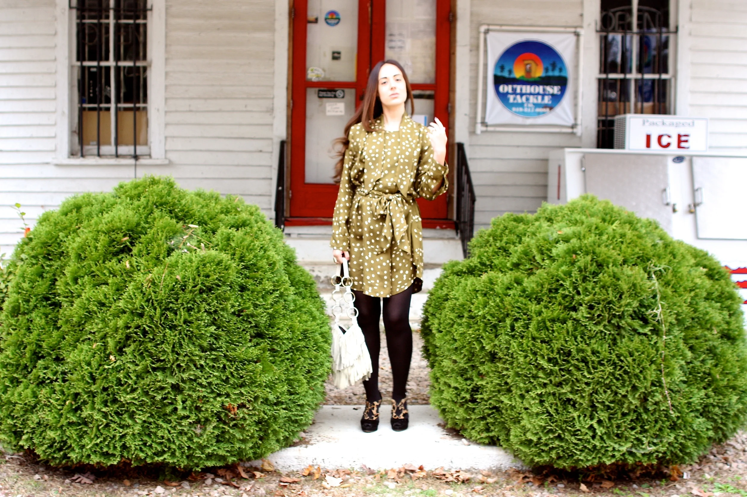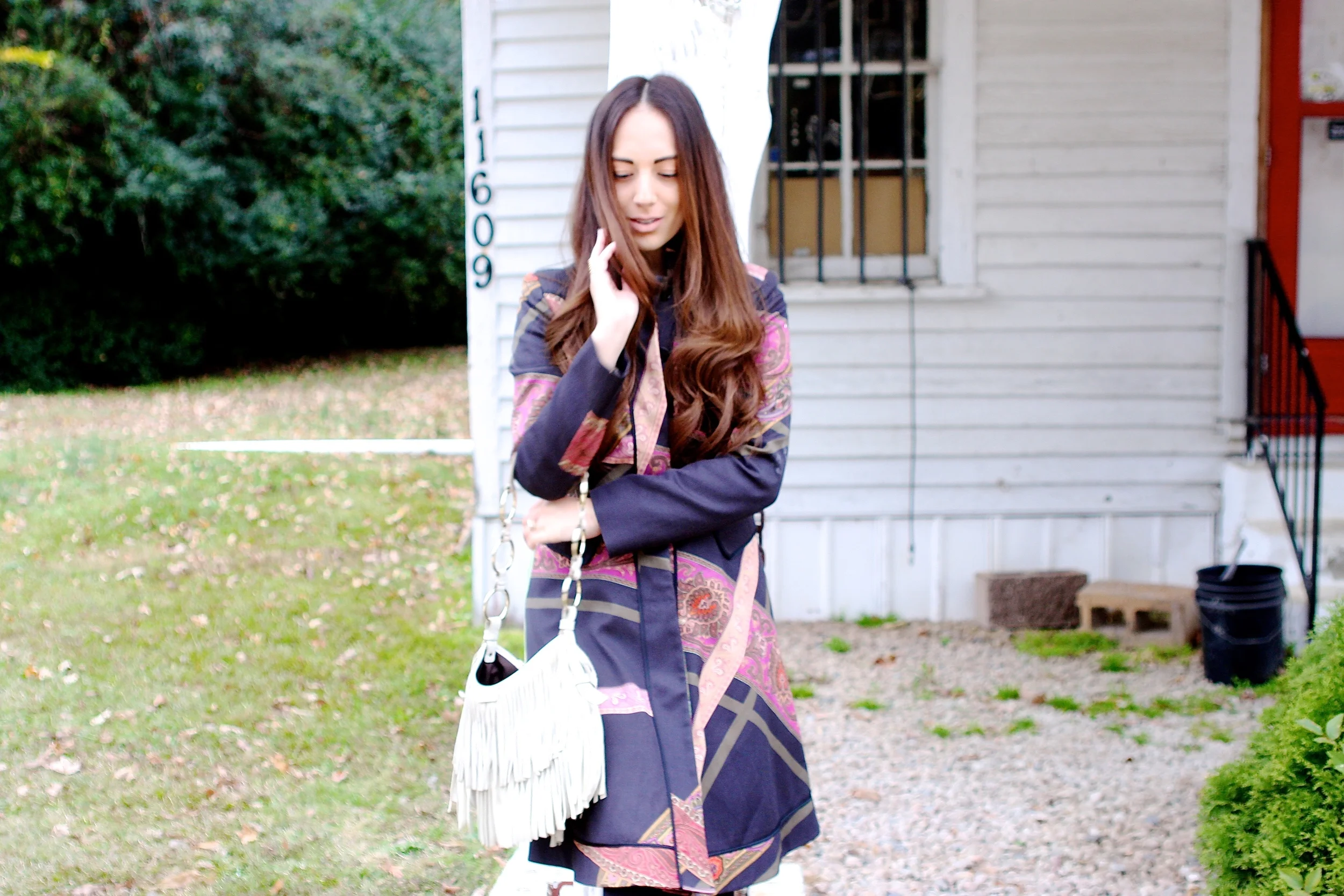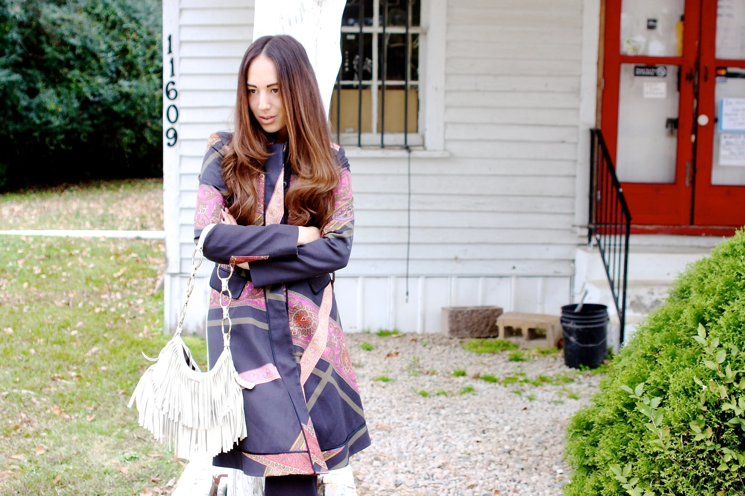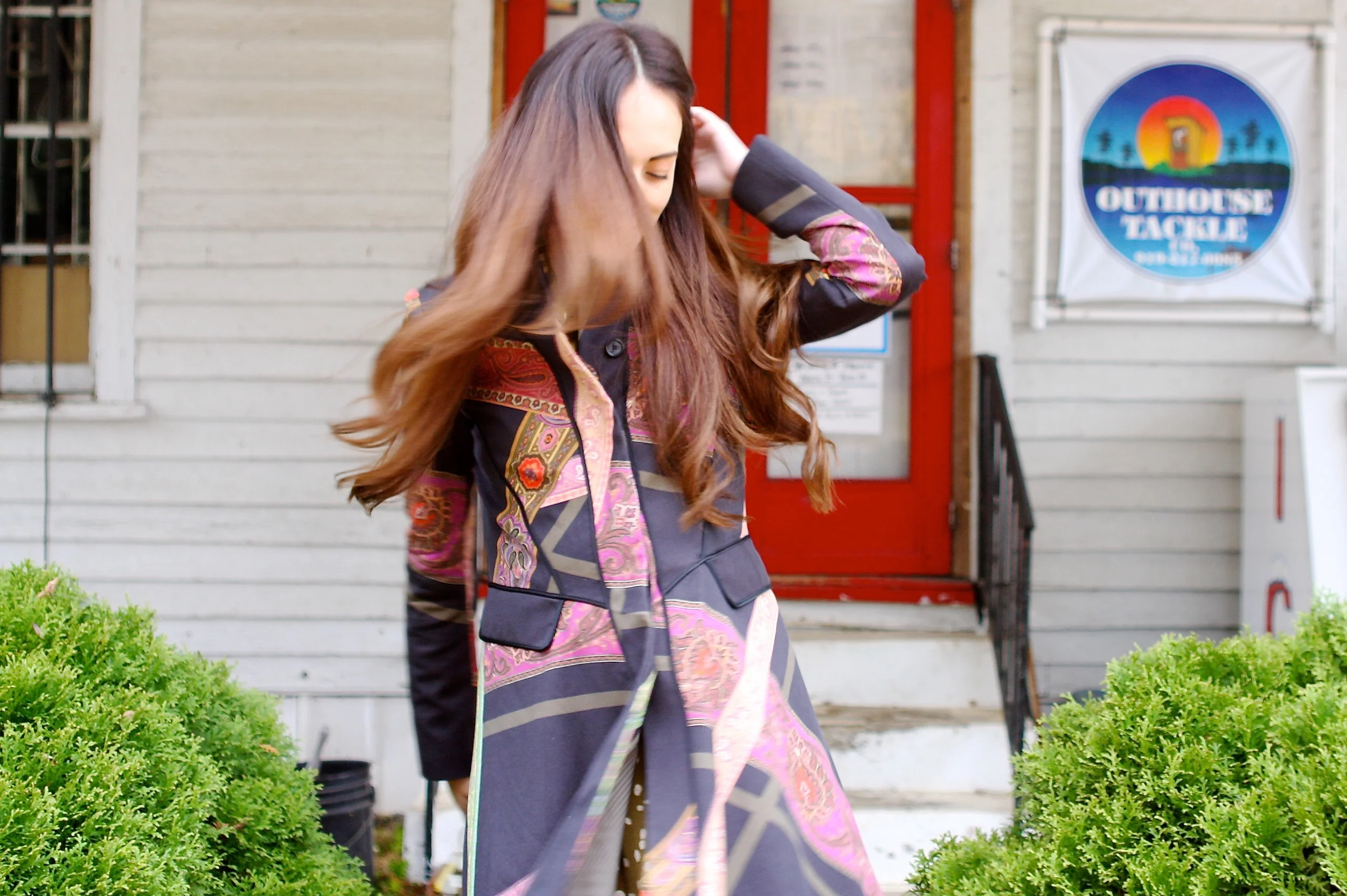 Coco wears an Isabel Marant Polka Dot Dress, Etro Paisley Swing Coat, Prada Leopard and Suede Sandals, Wolford Opaque 80 Tights, Saint Laurent Fringe Bag and Vintage Earrings.