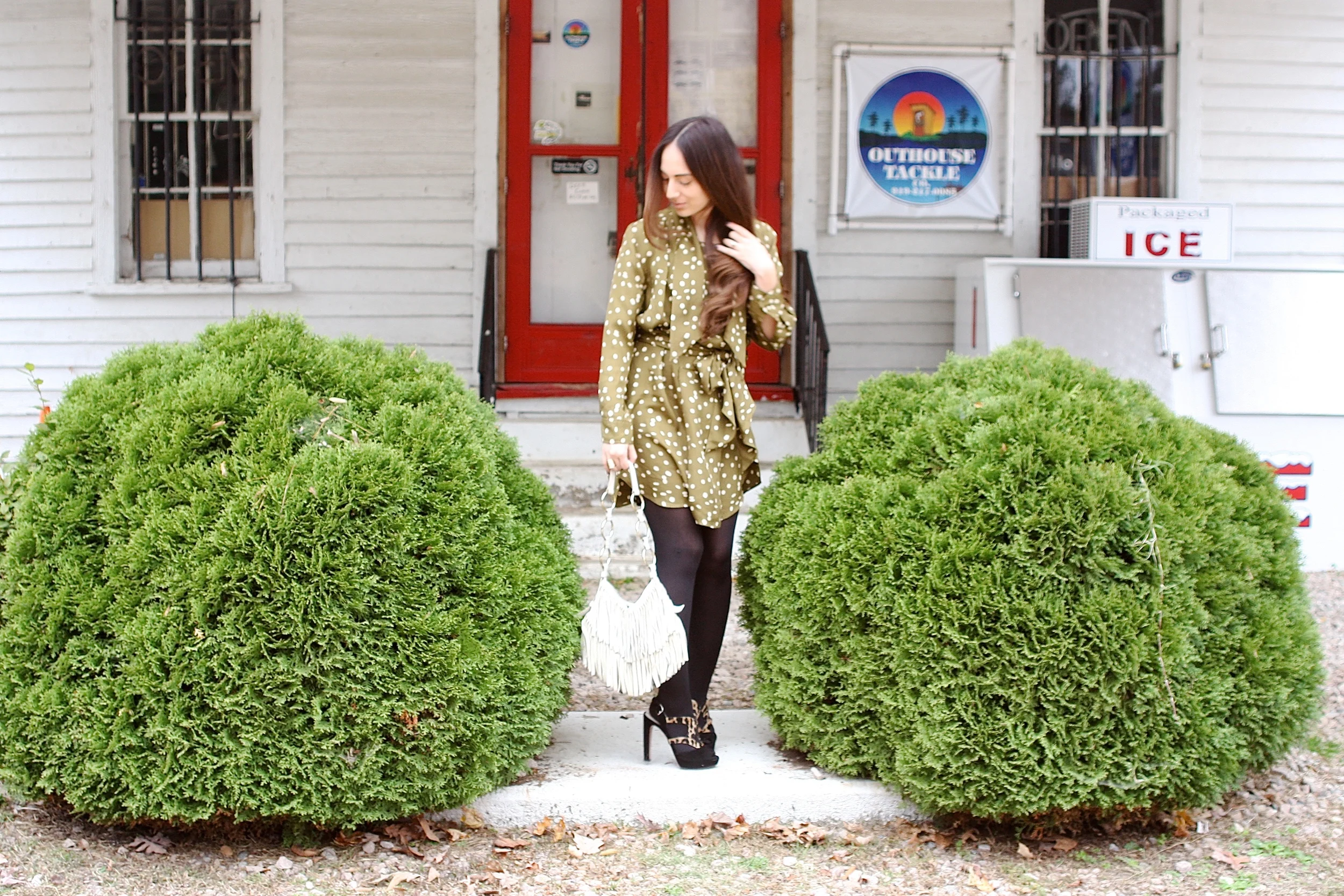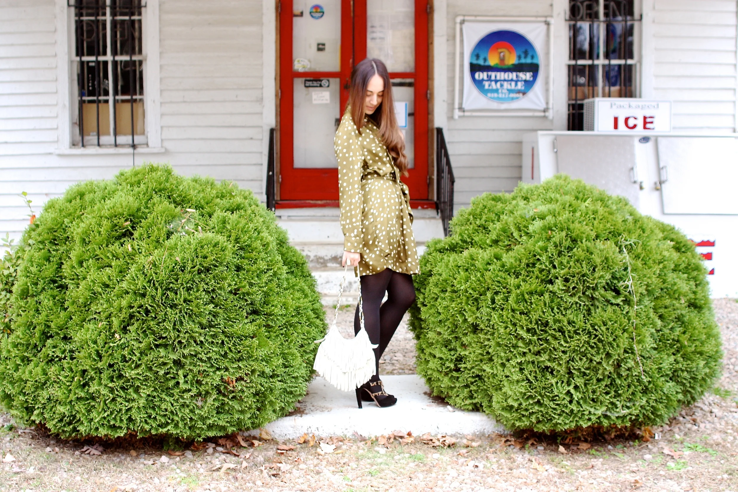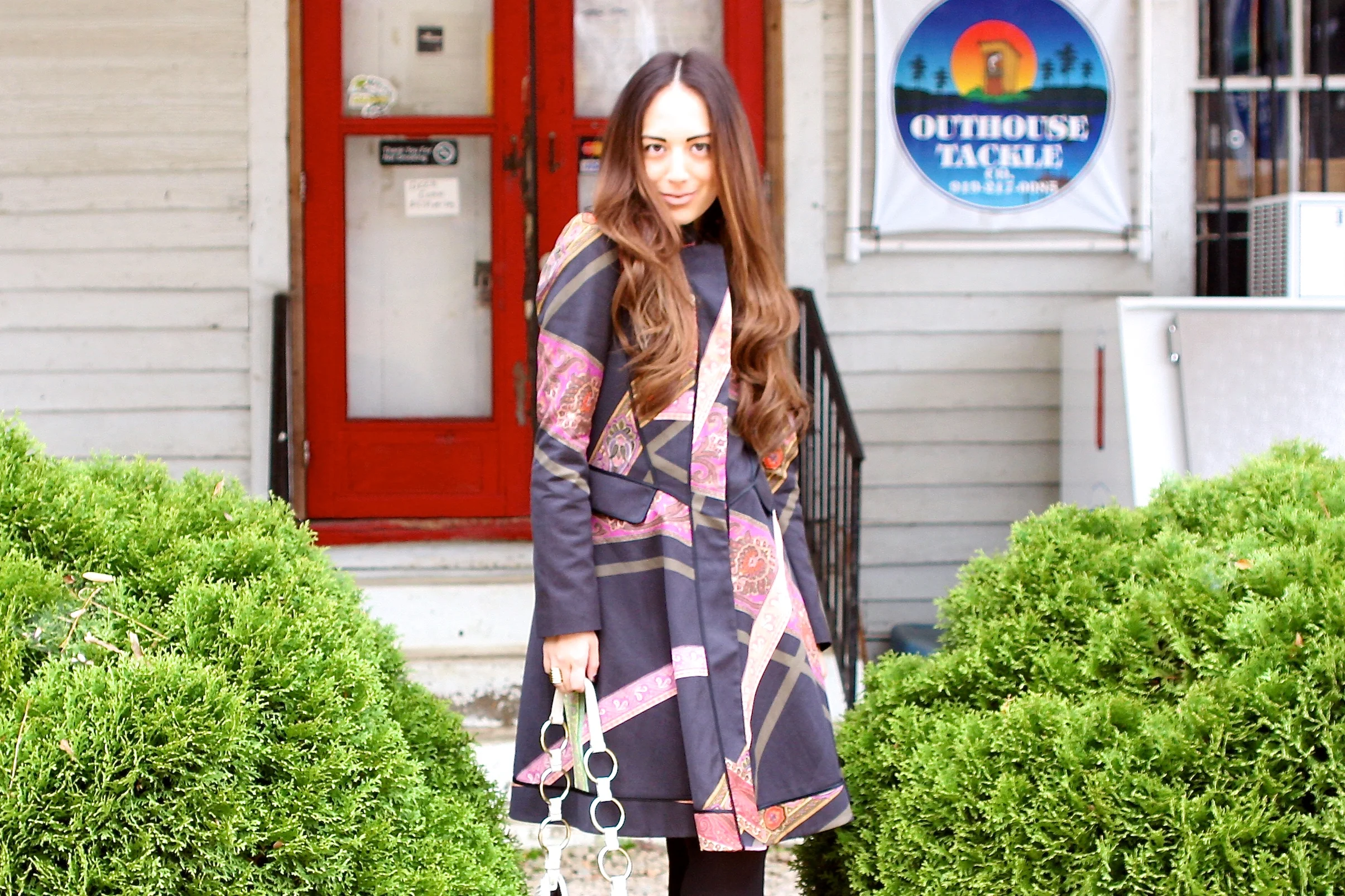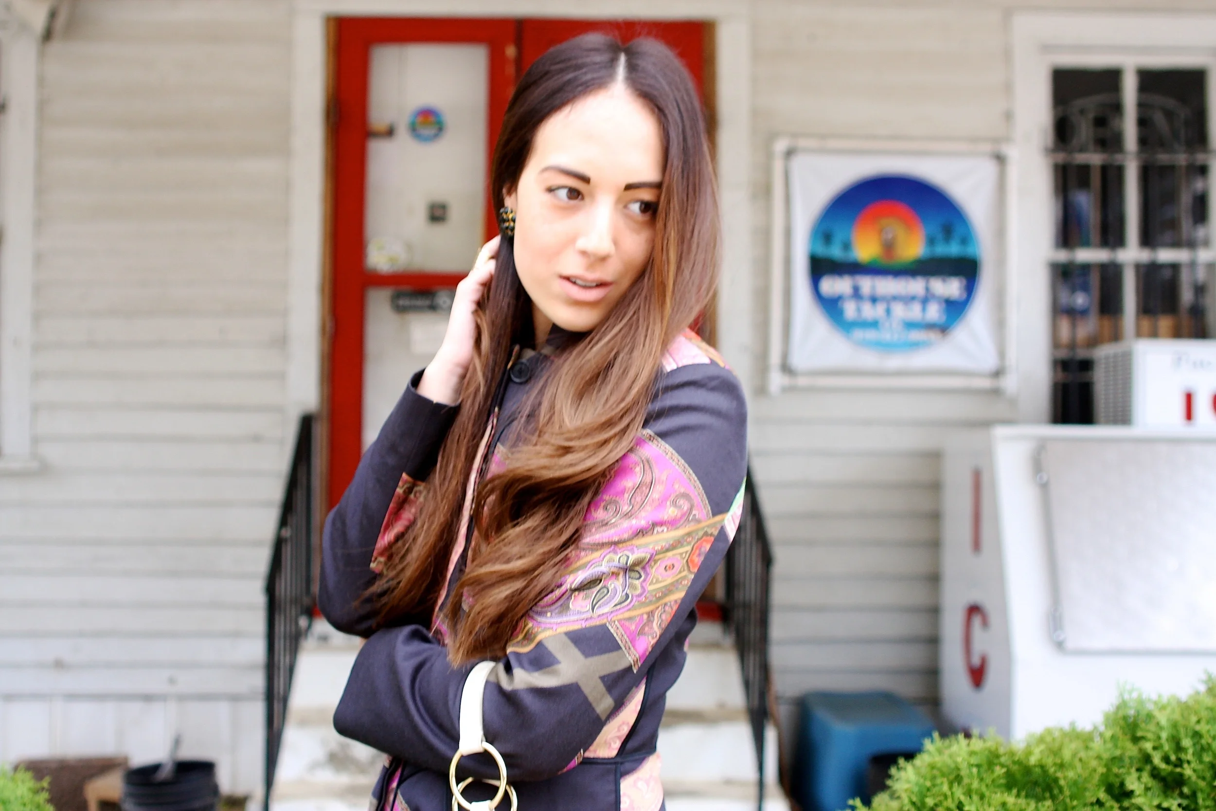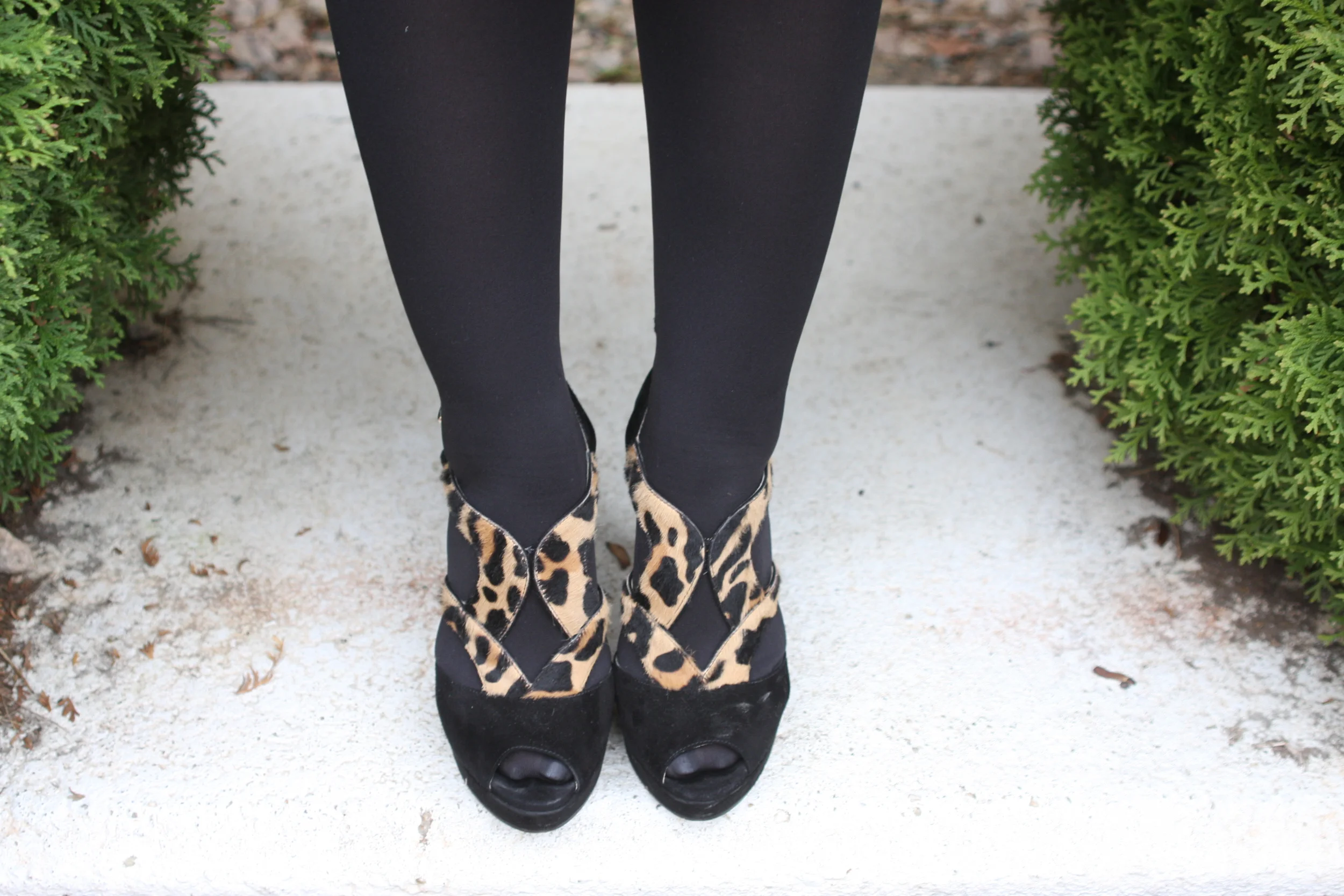 Coco wears an Isabel Marant Polka Dot Dress, Etro Paisley Swing Coat, Prada Leopard and Suede Sandals, Wolford Opaque 80 Tights, Saint Laurent Fringe Bag and Vintage Earrings.