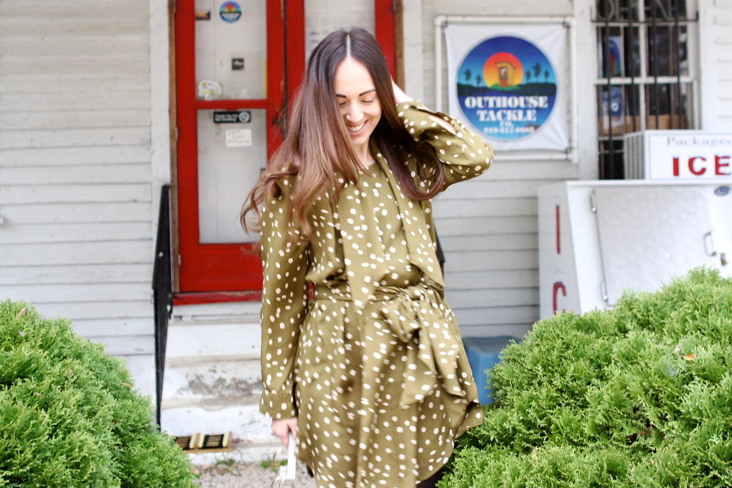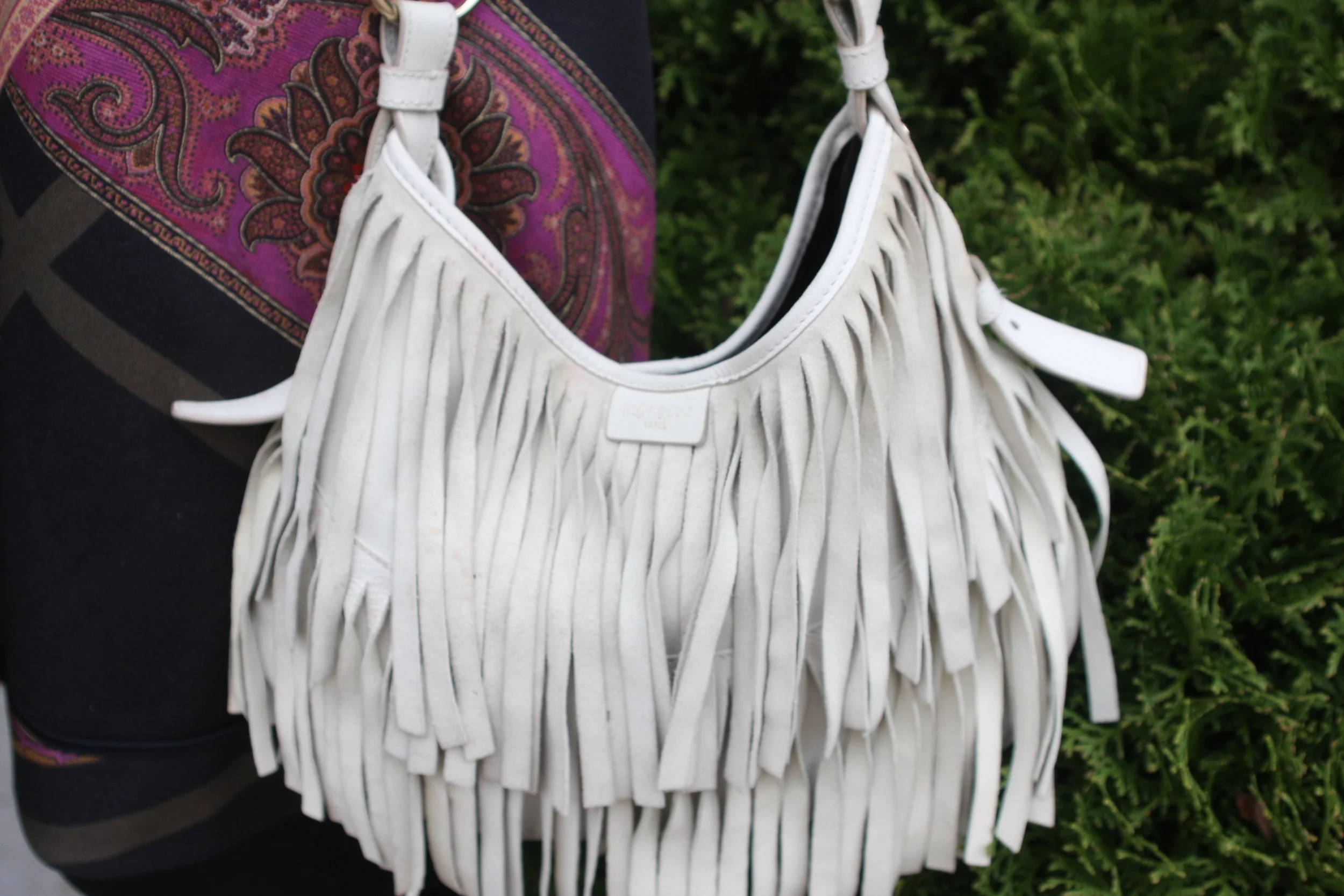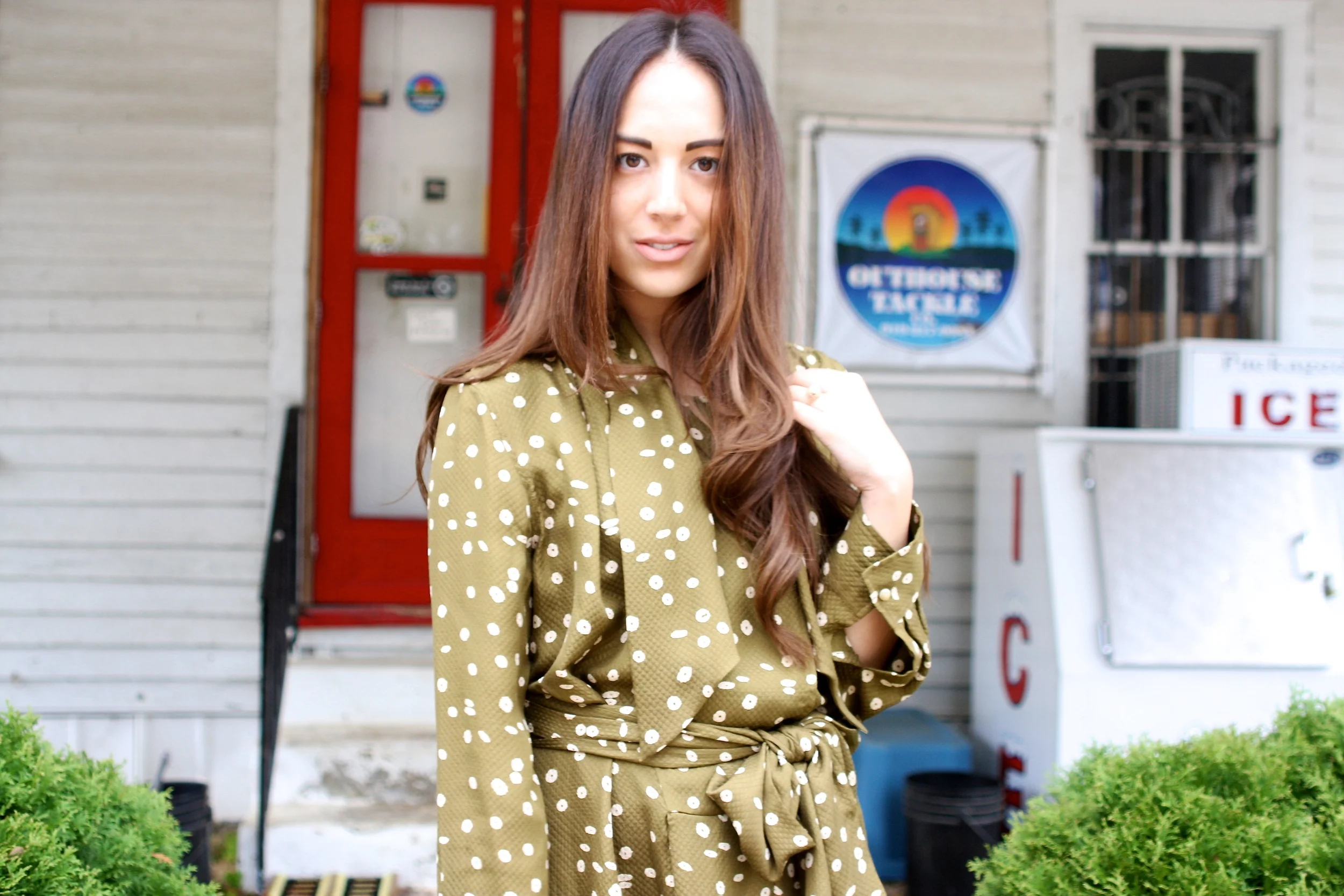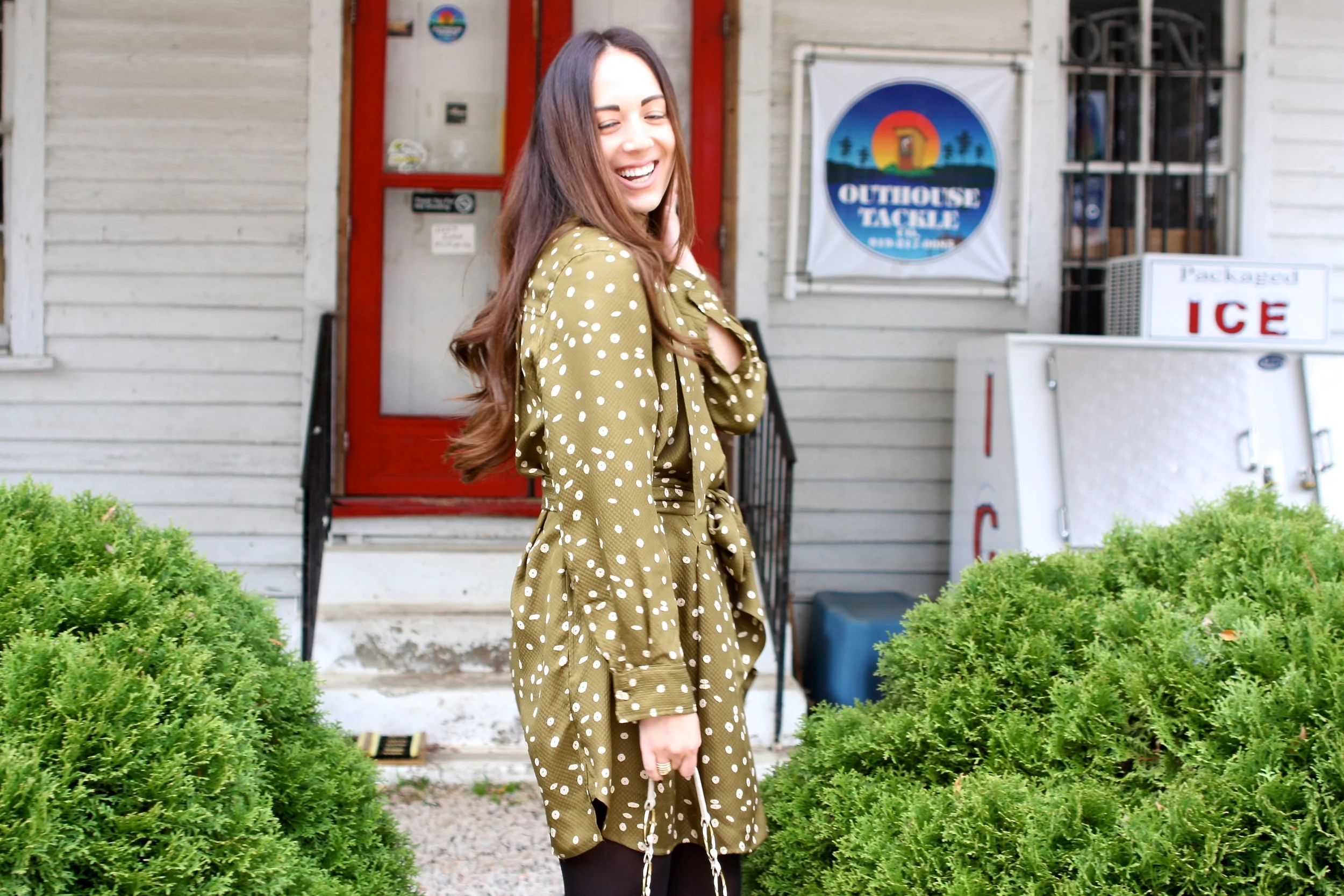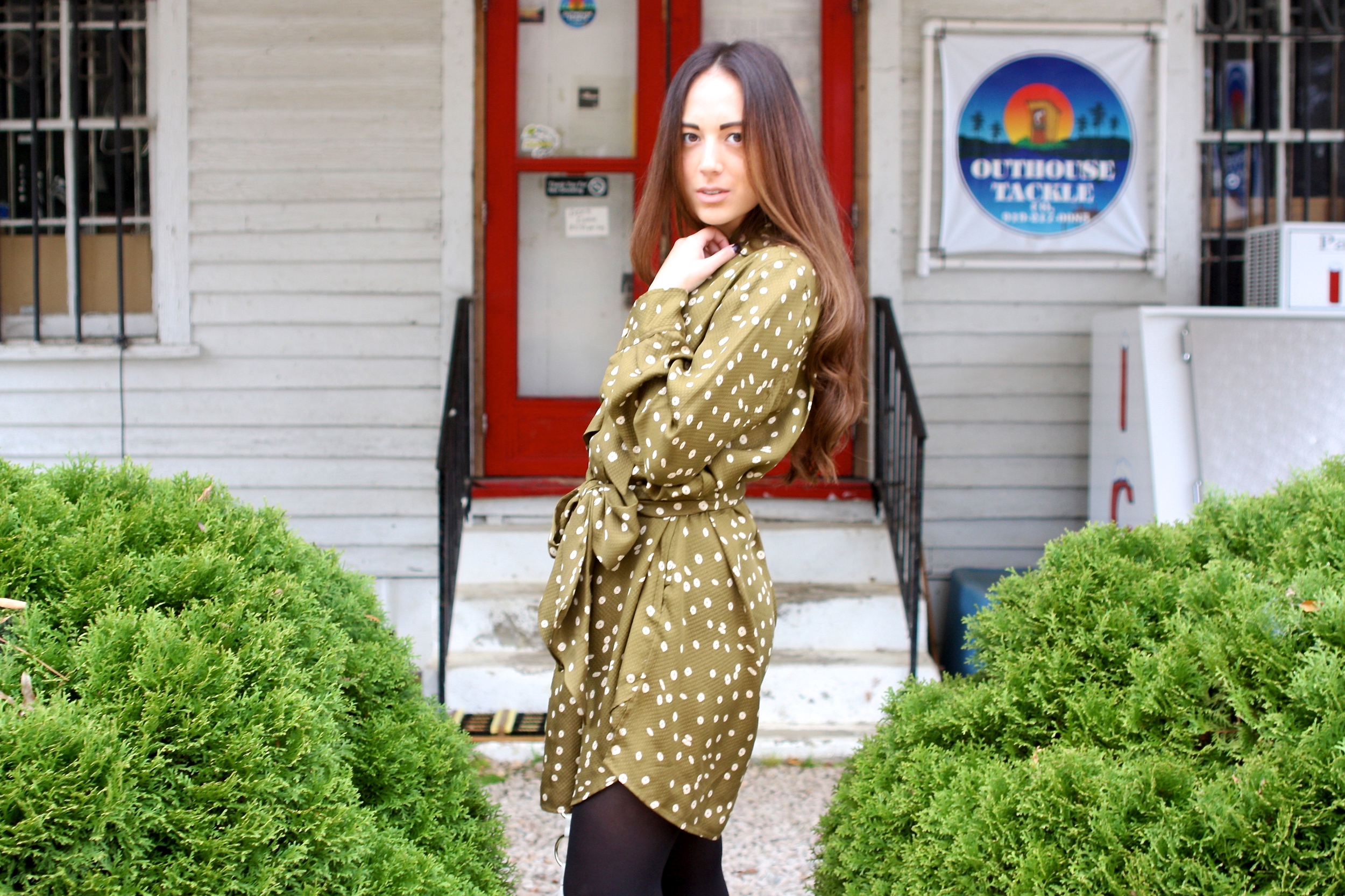 Coco wears an Isabel Marant Polka Dot Dress, Etro Paisley Swing Coat, Prada Leopard and Suede Sandals, Wolford Opaque 80 Tights, Saint Laurent Fringe Bag and Vintage Earrings.