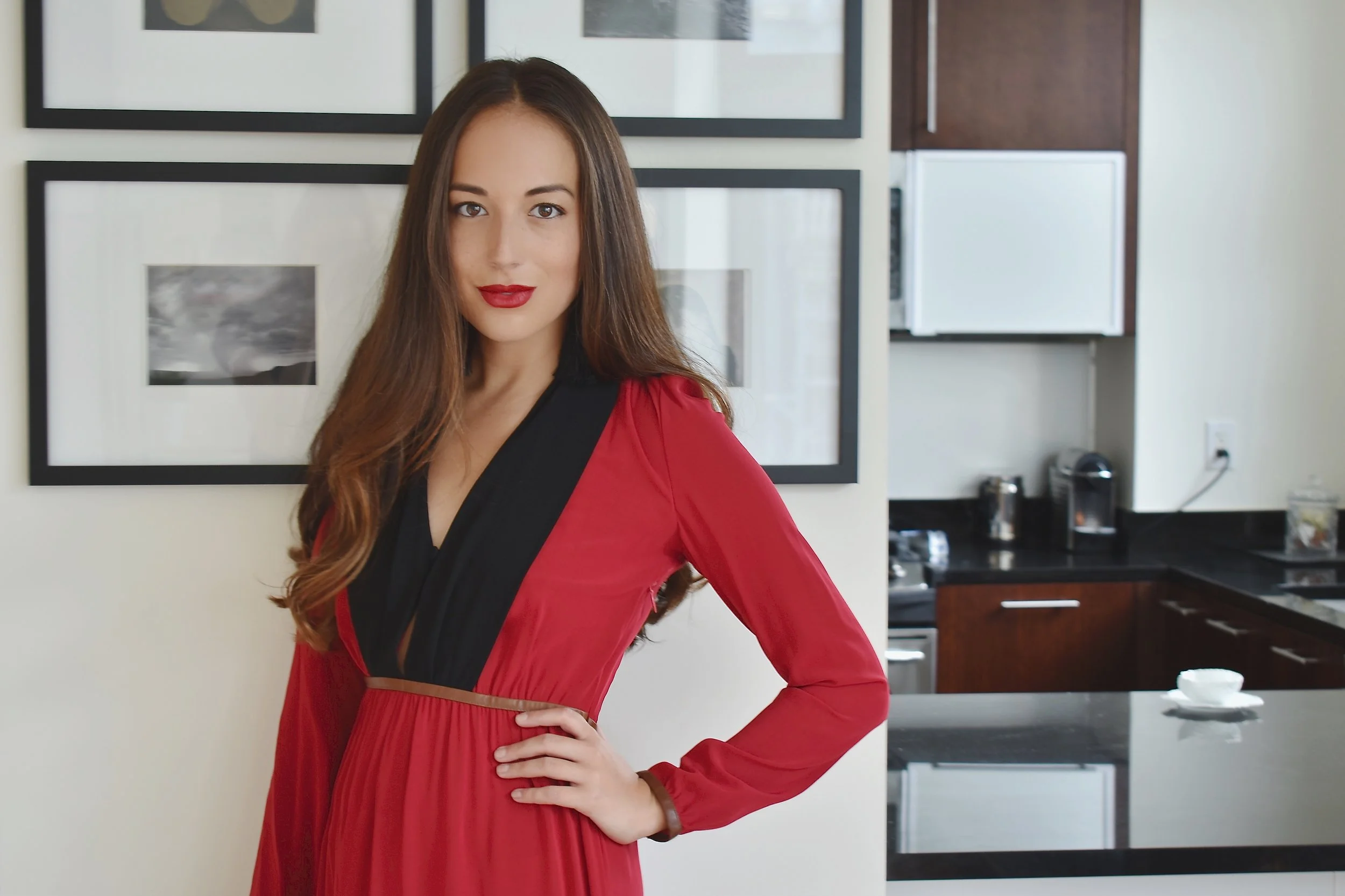 Coco Wears: Oscar de La Renta Ruffle Blouse, Vintage Navy Skirt, Patent Prada Platforms/ Red Silk Prada Dress/ Vintage Beaded Gown. Photographer: Dana Ferraro. Location: My home in Dumbo, Brooklyn. City Guide: Brooklyn.
