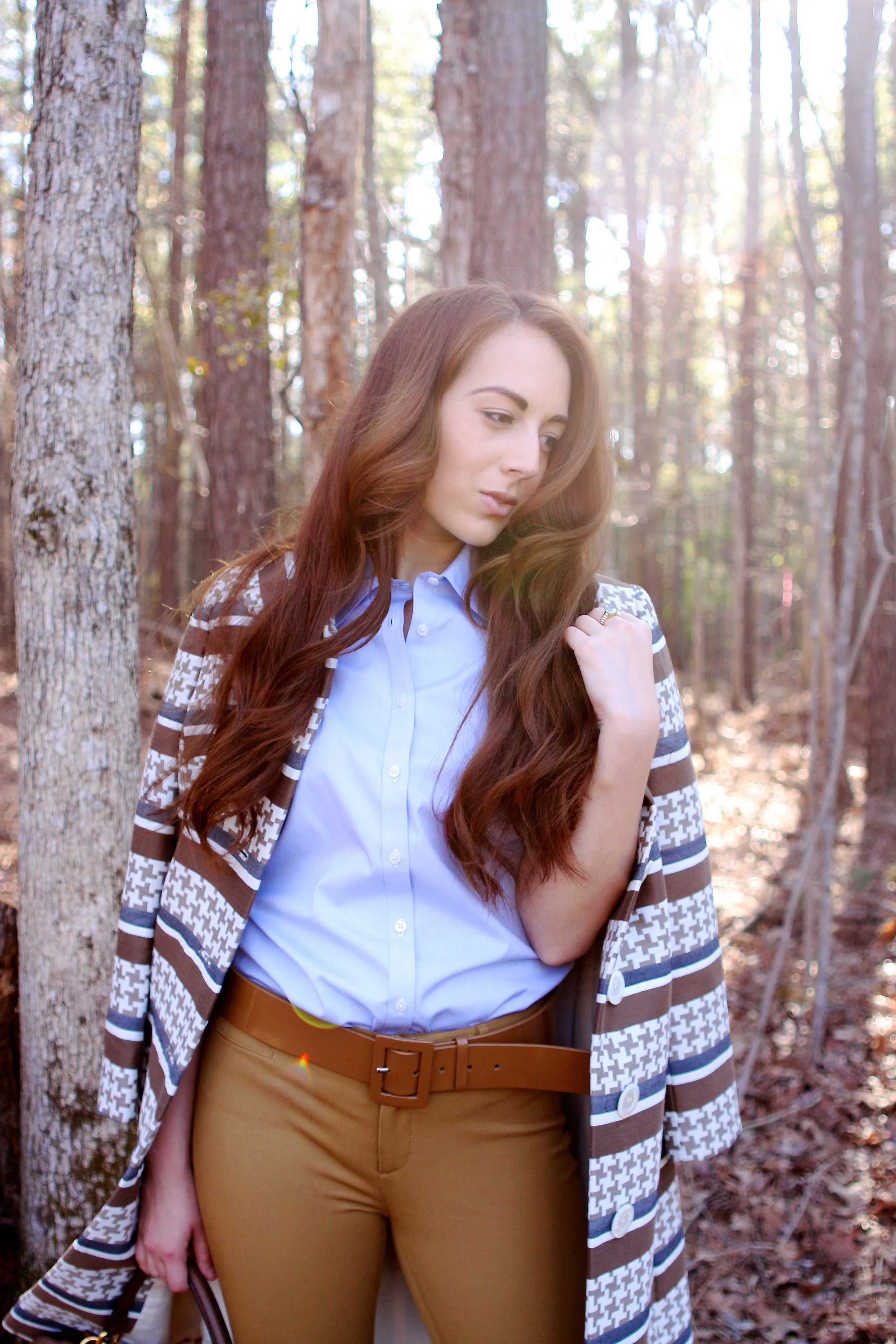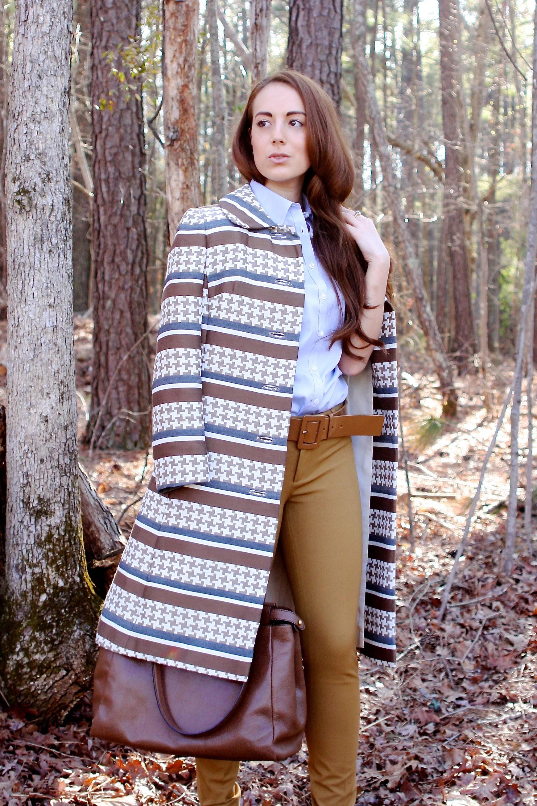 Coco wears a Brooks Brothers Sleeveless Button-Up Collared Shirt, Banana Republic Khaki Trousers, Miu Miu Python Open-Toe Sandals, Vintage Patent Leather Belt, Fendi Peek-a-boo Pebbled Handbag, Vintage 60s Coat