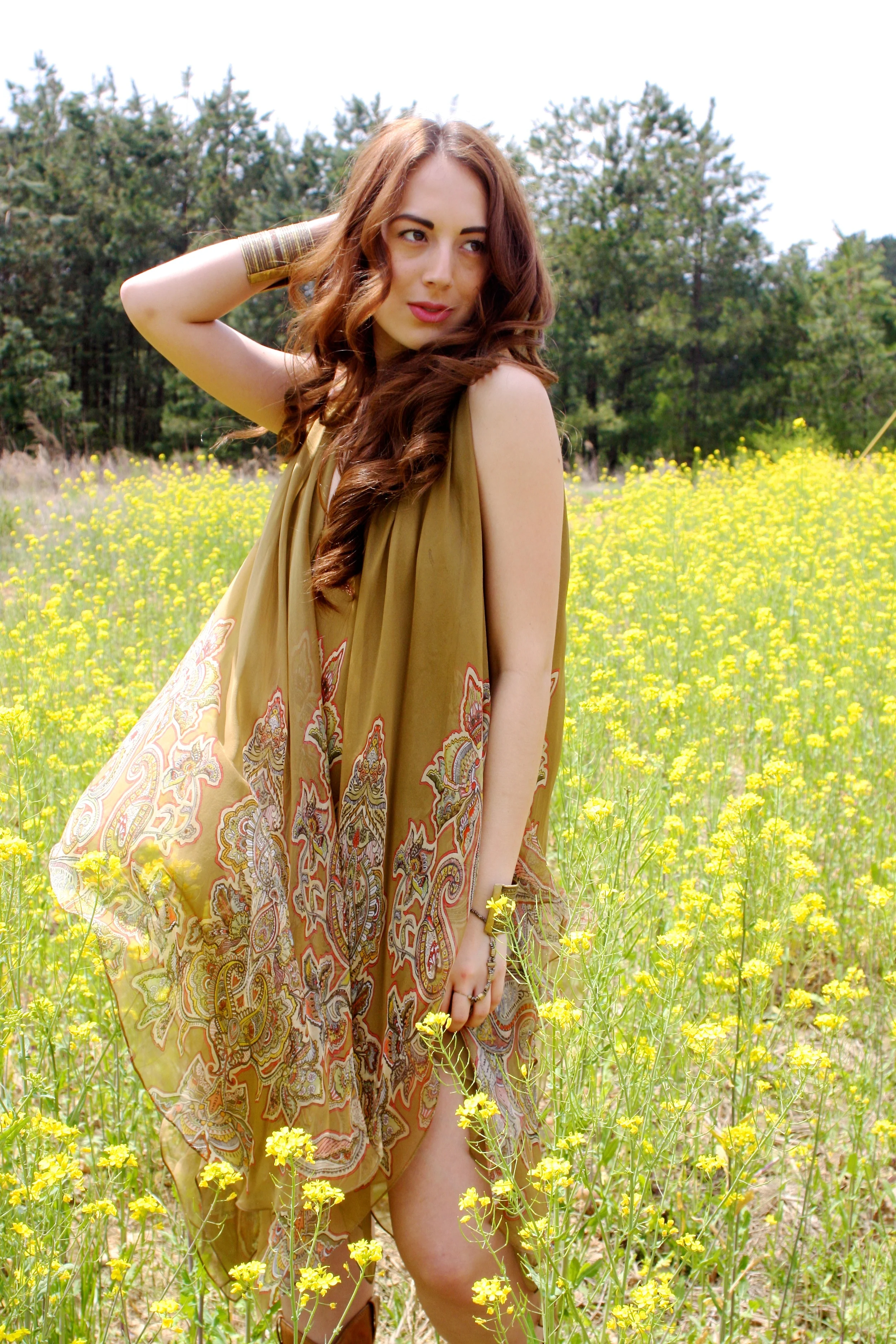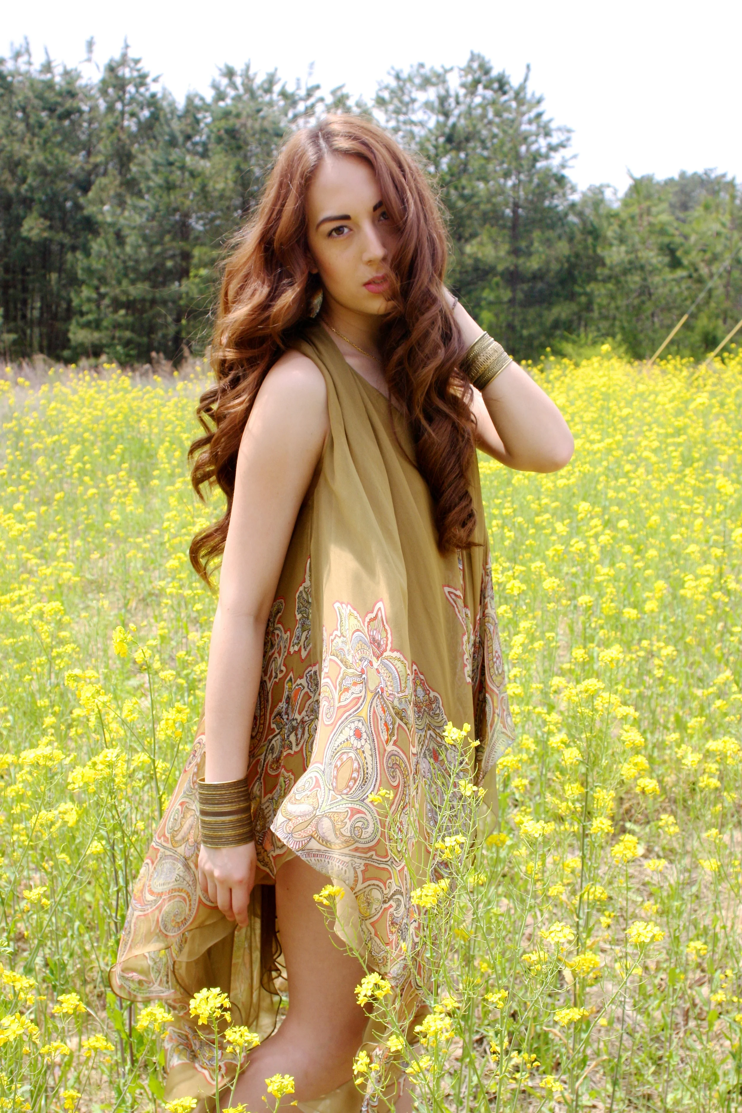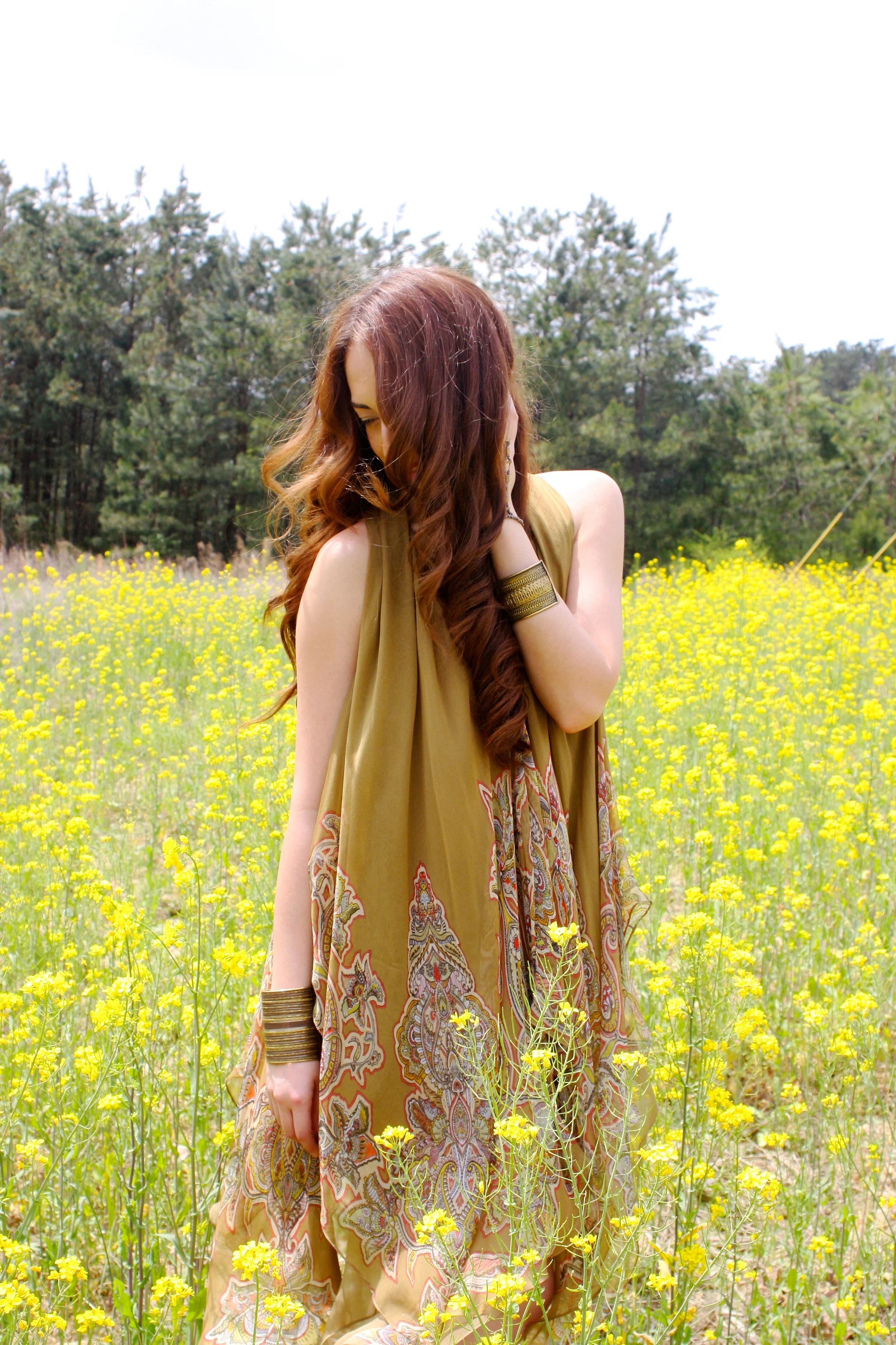 These yellow flowers took me back in time to my childhood; a time when I would run around in the fields in our backyard. I would always be wearing a dress and I would usually be covered in mud or with feathers coming out of my hair. My mother would be chasing me; I would be giggling and life at that moment was more than complete. I was fortunate enough to pay homage to my deep support for nature, while taking these photos and it's now a memory that I will cherish. I really enjoy the idea of the paradox between authentic fabrics and esoteric shapes and this McQueen dress completely brightens up my world.
