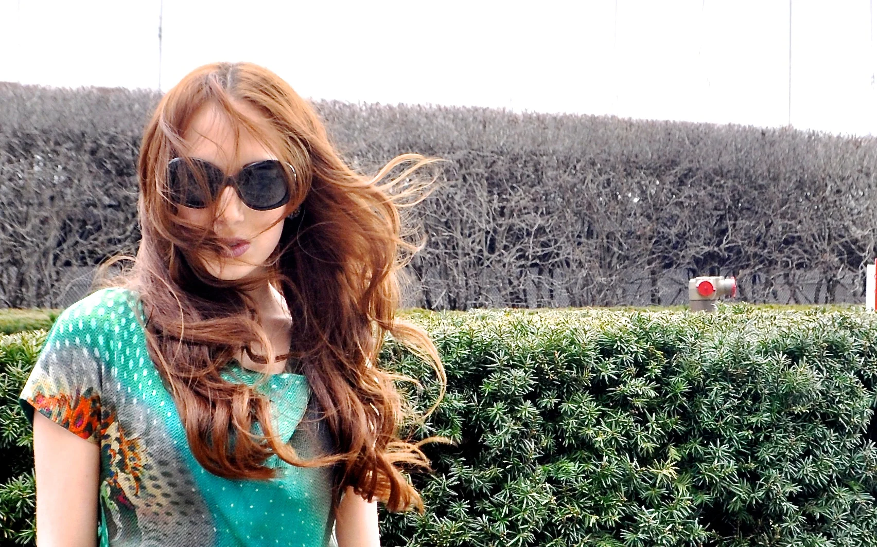 Coco wears an Etro Dress, Saint Laurent 4" Tribtoo, Hermes Bracelet, Vintage Gold Bracelet from India, Vintage Sputnik Blue and Gold Earrings,Theory Fur Scarf, Chanel Sunnies