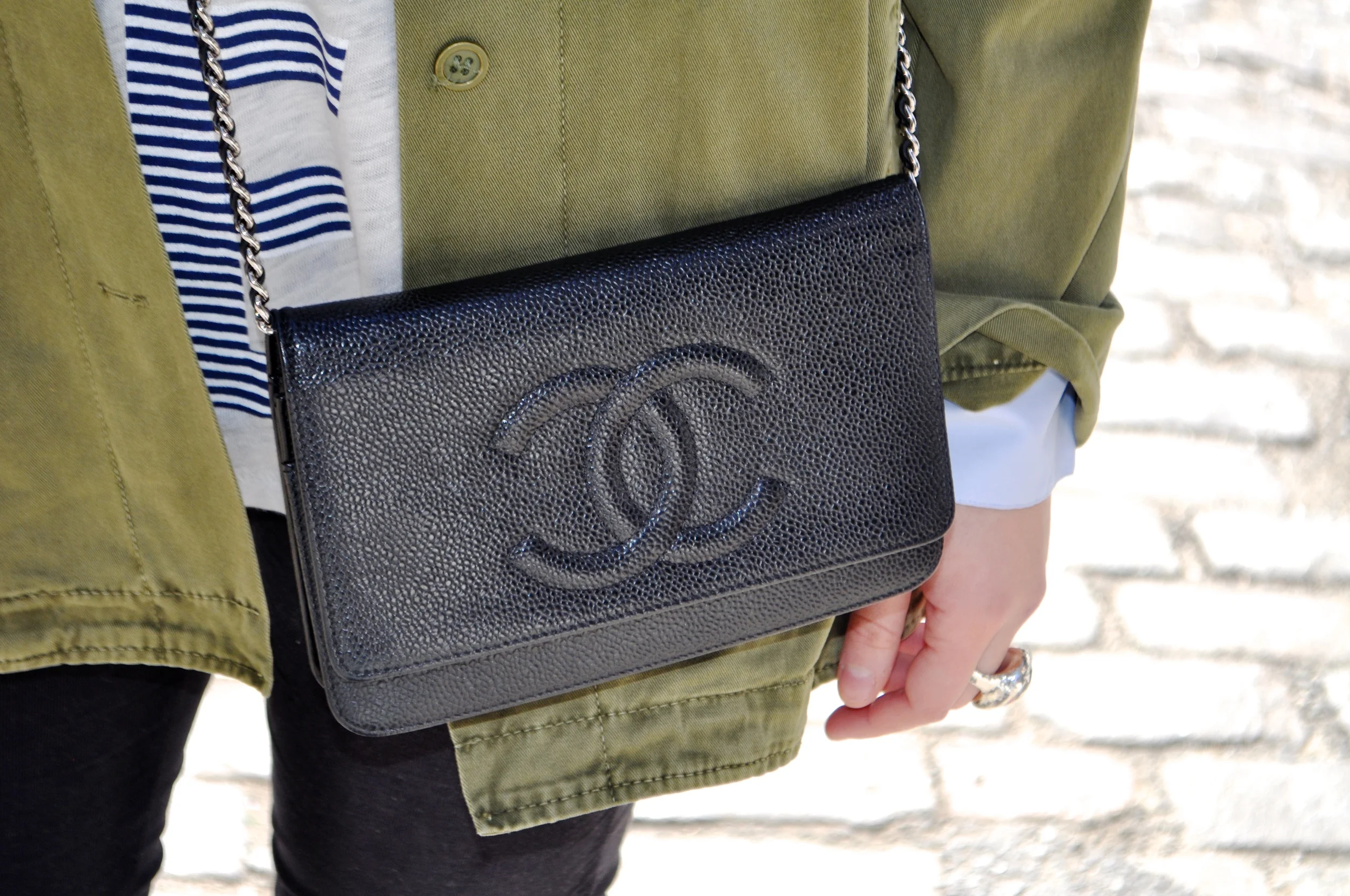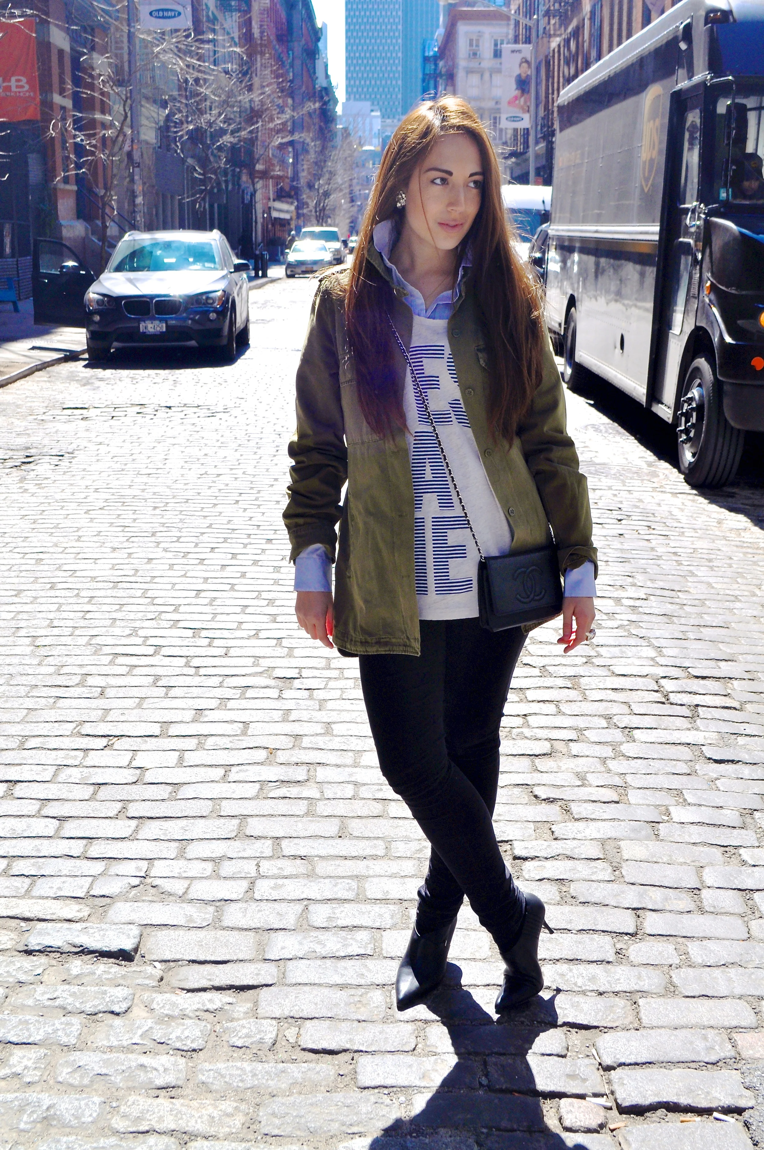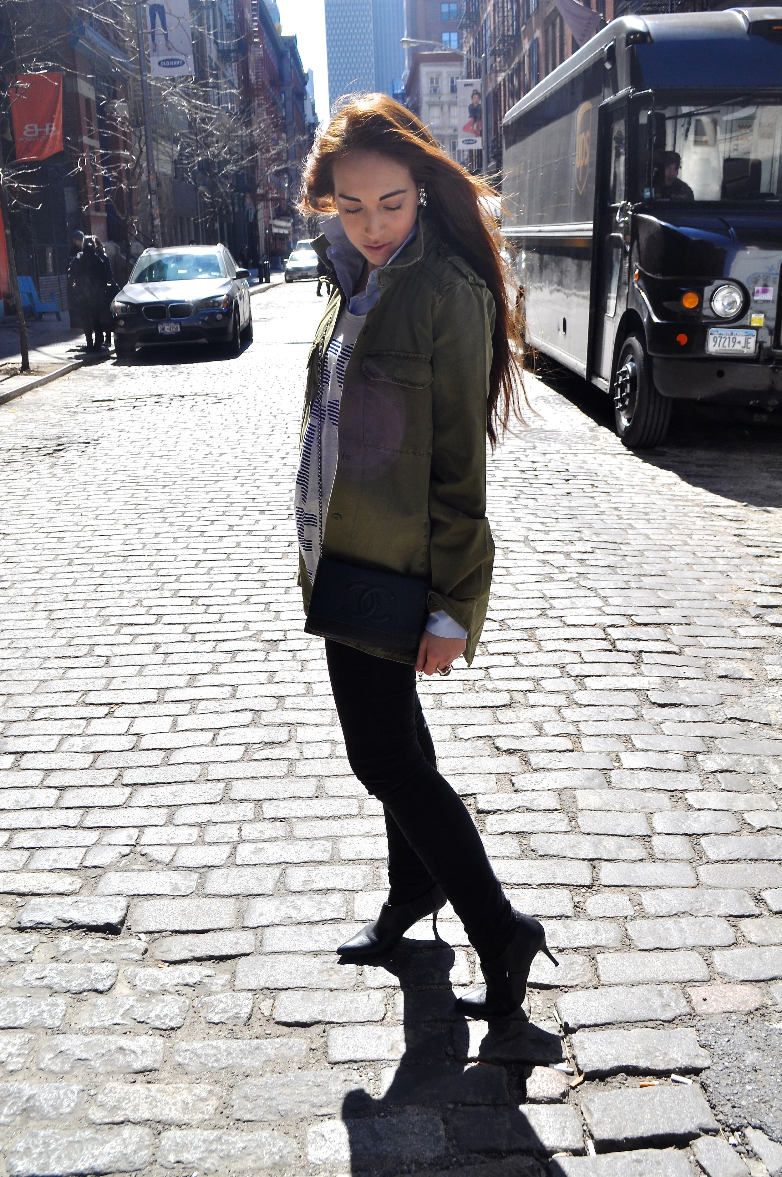 Coco wears a Forever 21 Green Utility Jacket (similar, and if you're FANCY), Uniqlo Broadcloth Long Sleeve Collared Shirt, J. Crew C'est La Vie Tee Shirt in XL, AG Black Cords, Calvin Klein Collection Pointed Booties, Vintage Earrings, Chanel Wallet with a chain, Ippolita Black Pearl Pear Ring (similar)