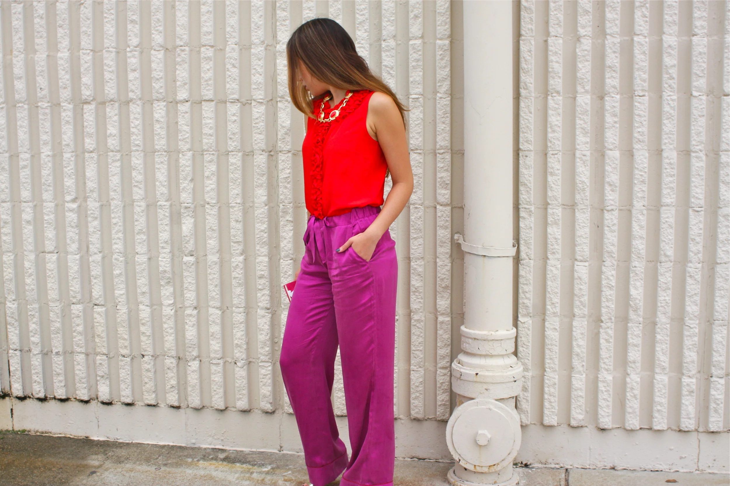 Coco wears a Marni Sleeveless Blouse, Equipment Silk PJ Pants, Vintage Necklace, Moschino Soft-serve Ice Cream iPhone Case (French Fries), Clarks Wedges (thanks for letting me be a copycat Pallavi!) We all know my LOVE for color-blocking.
