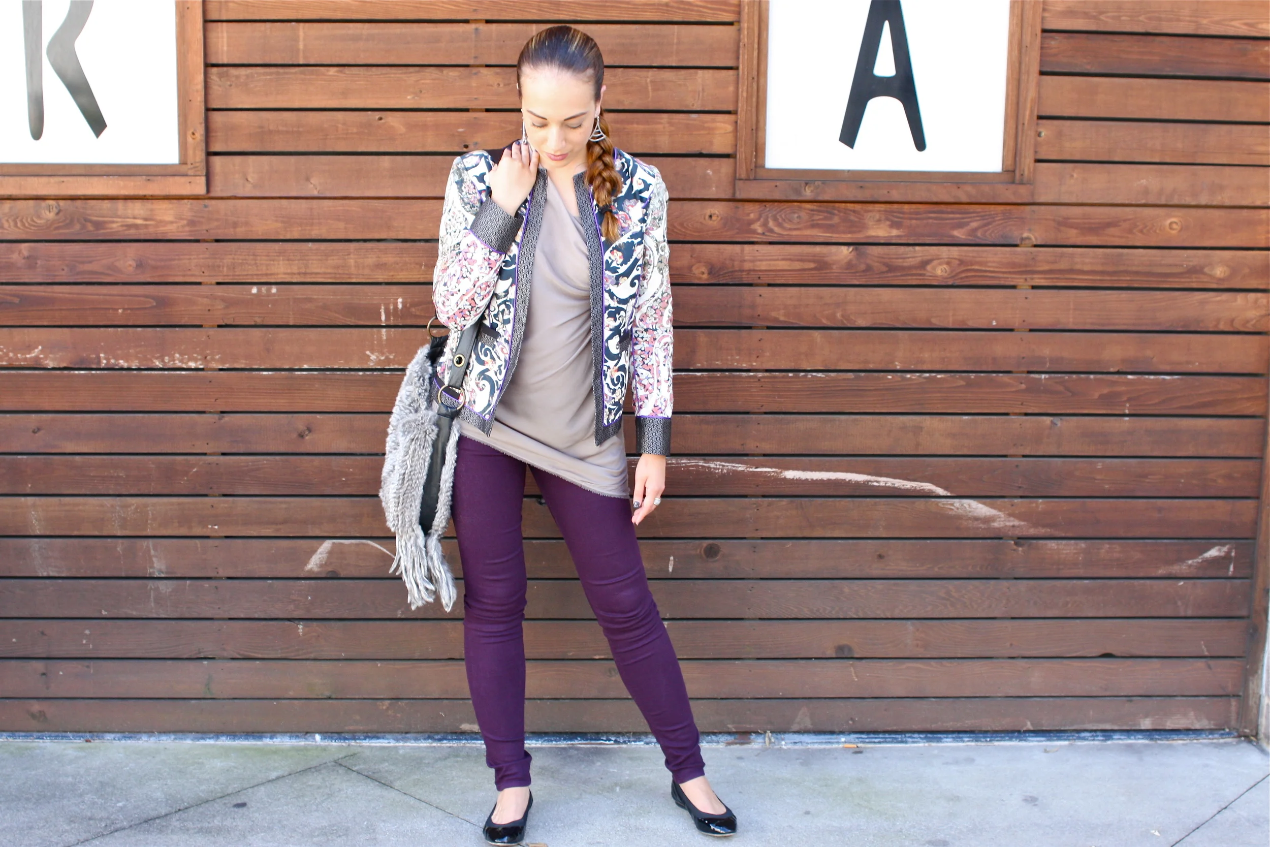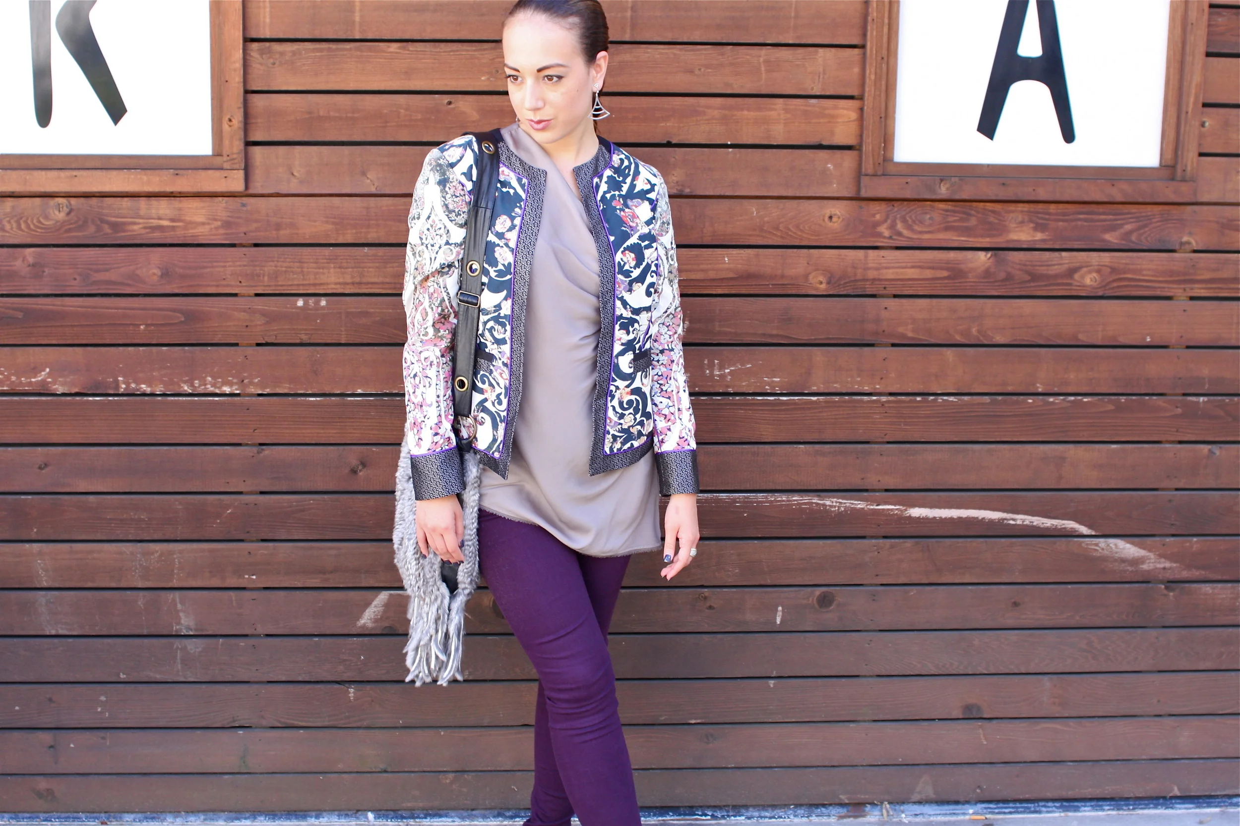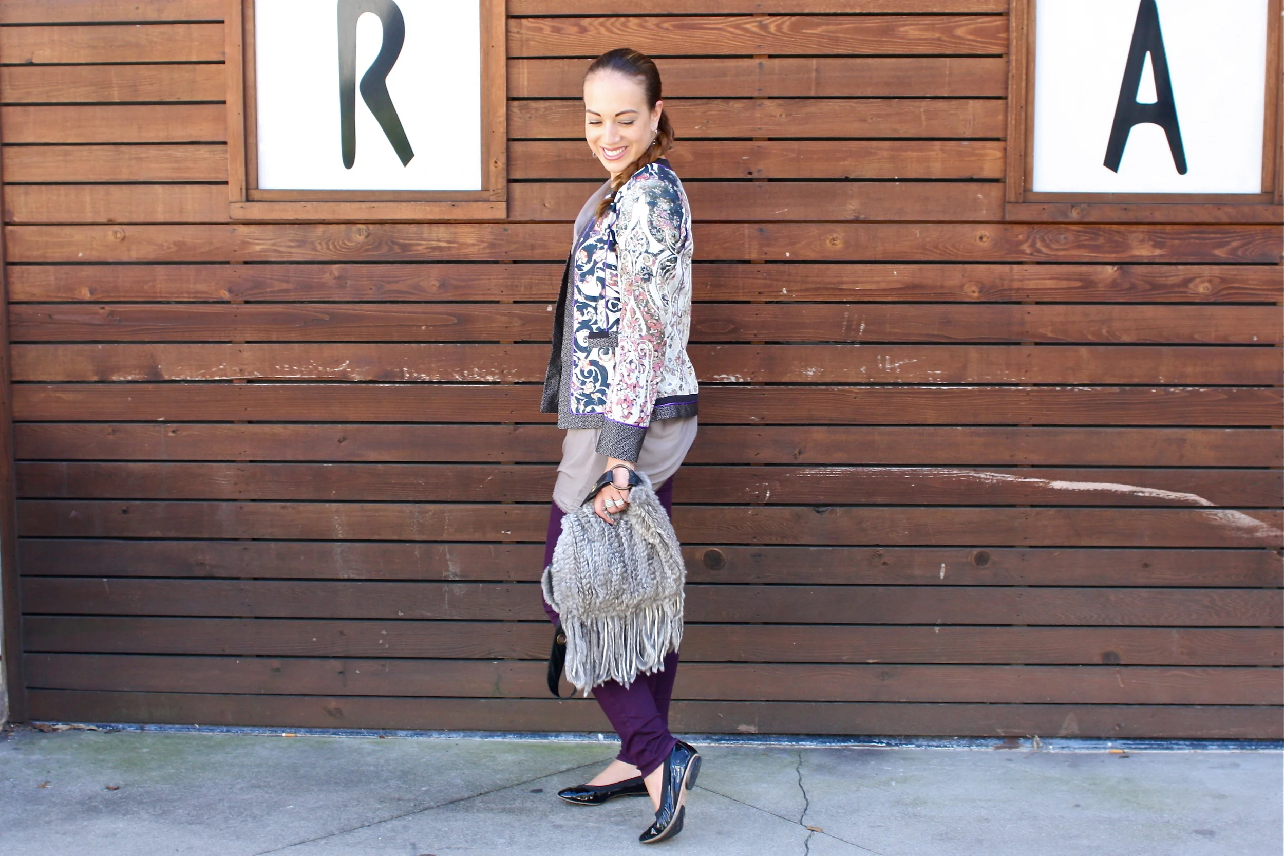 Coco wears an Etro Oriental and Paisley Jacket, Helmut Lang Asymmetrical Top, Rag & Bone Denim, Chanel Patent Sport Flats, Italian Fur and Fringe Cross-body and David Yurman Ring.