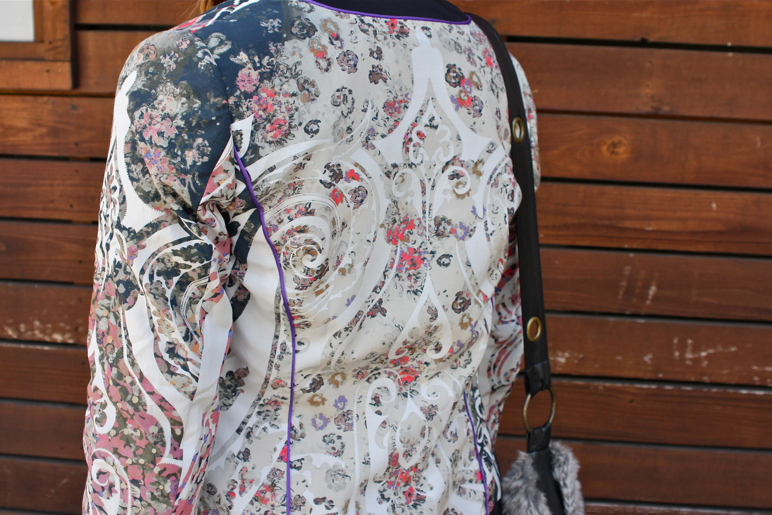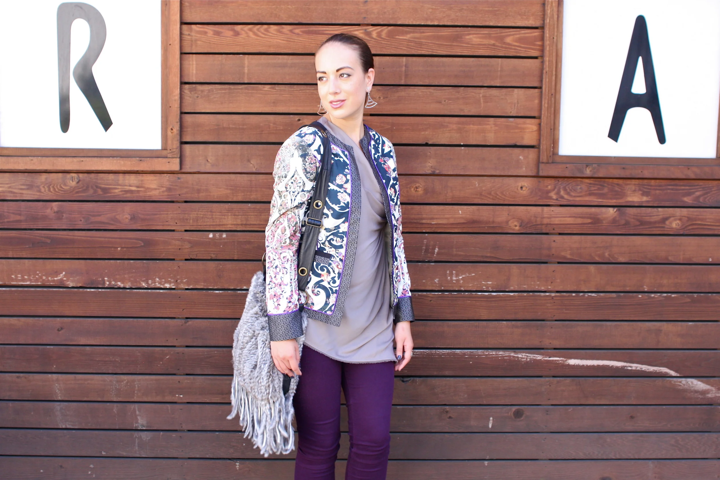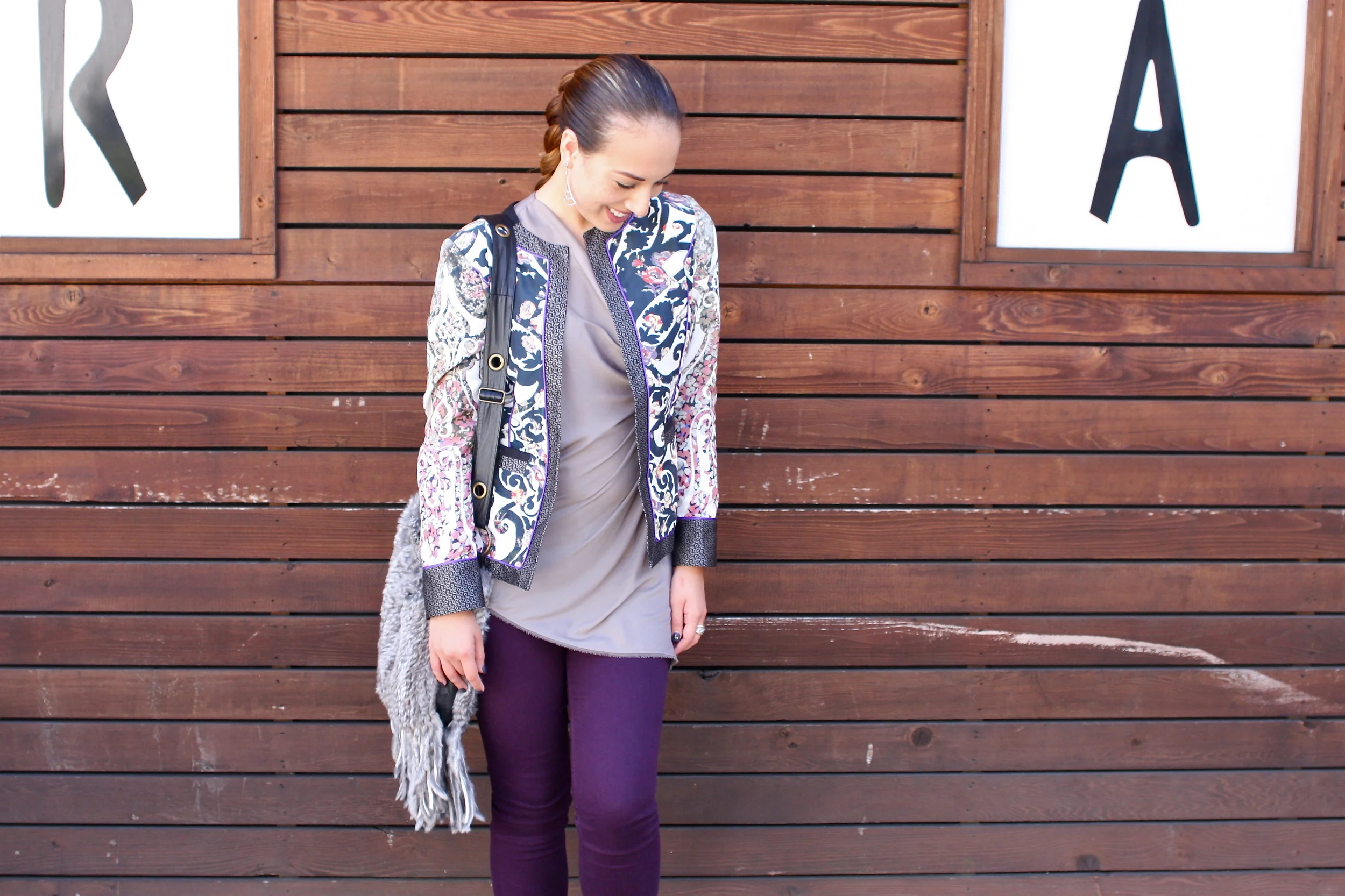 Coco wears an Etro Oriental and Paisley Jacket, Helmut Lang Asymmetrical Top, Rag & Bone Denim, Chanel Patent Sport Flats, Italian Fur and Fringe Cross-body and David Yurman Ring.