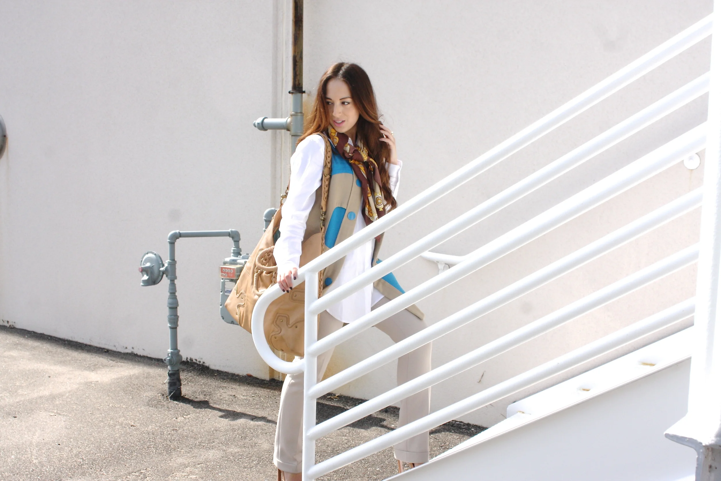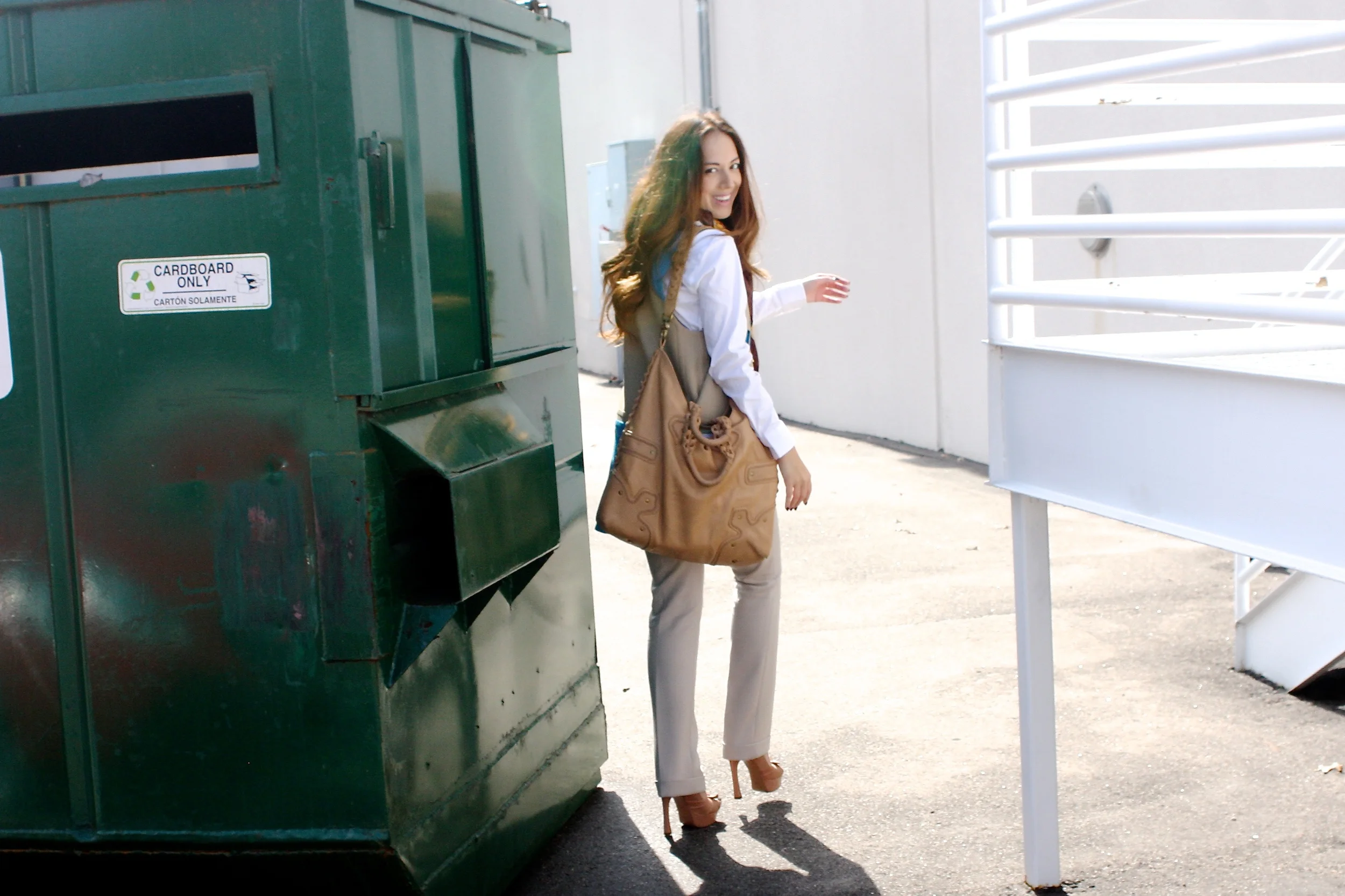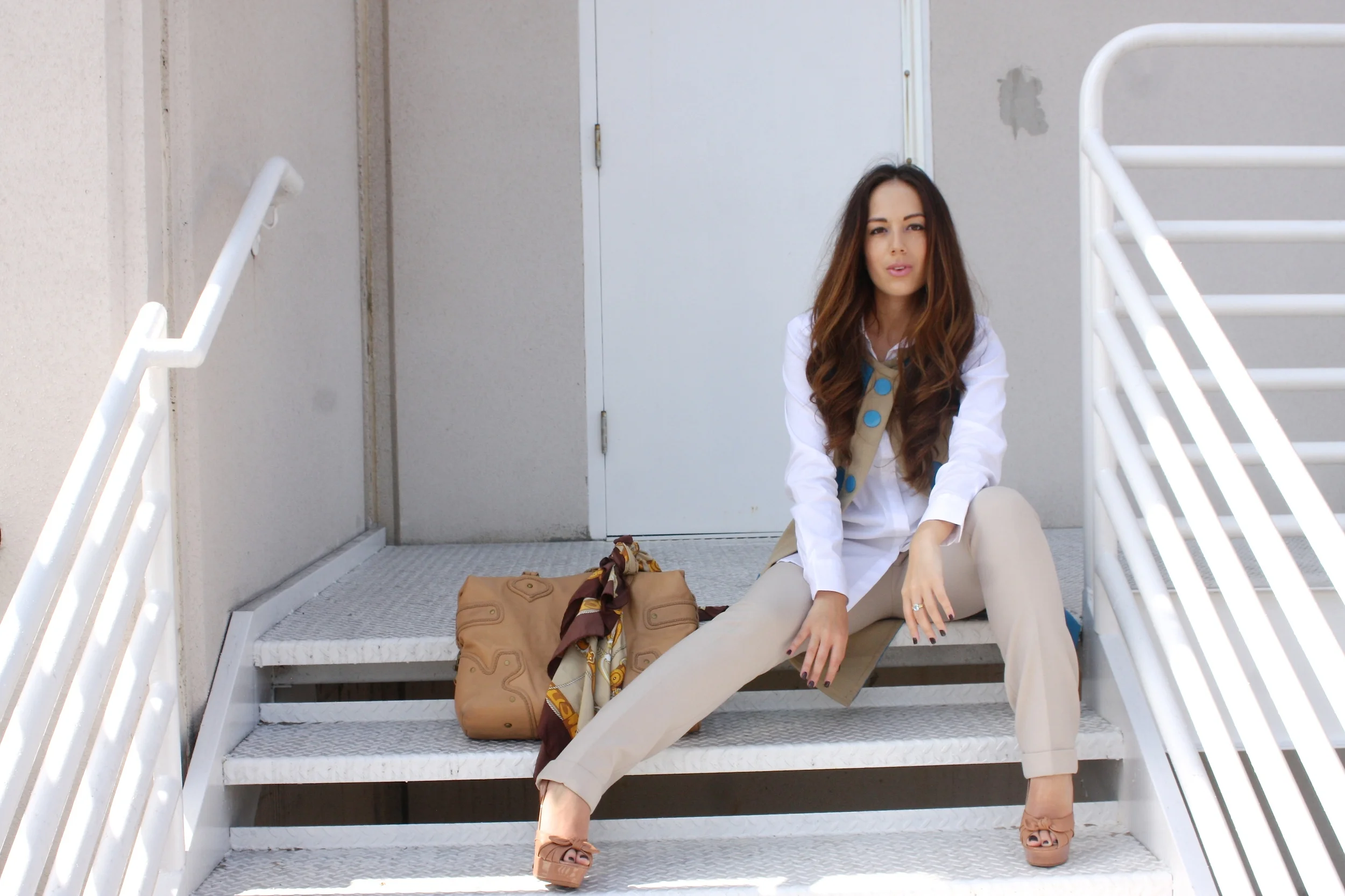 Coco wears a Marc Jacobs Camel Dress, Dries Van Noten White Collared Shirt, Zara Beige Trousers, Saint Laurent Patent Heels, Italian Camel Leather Bag.