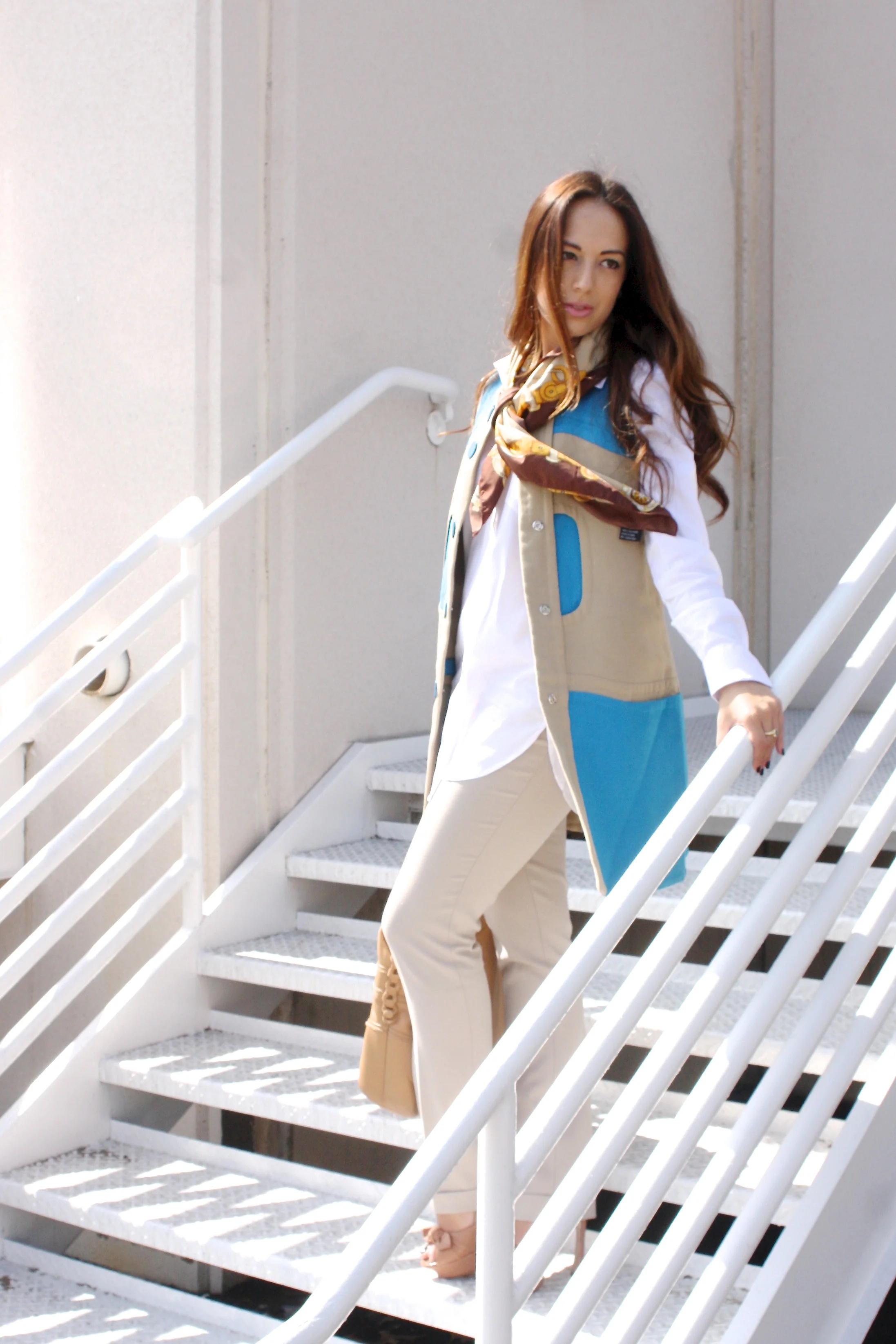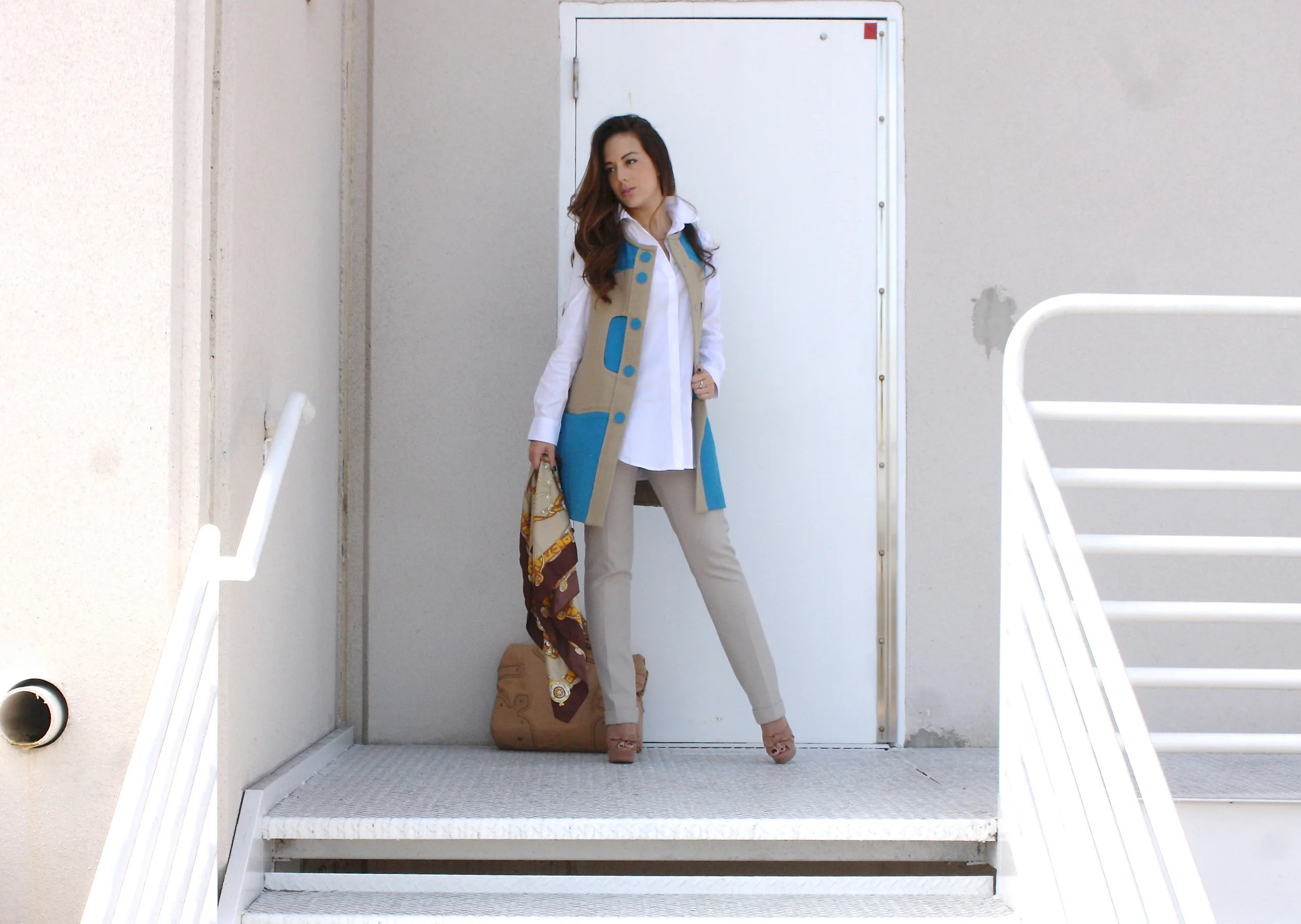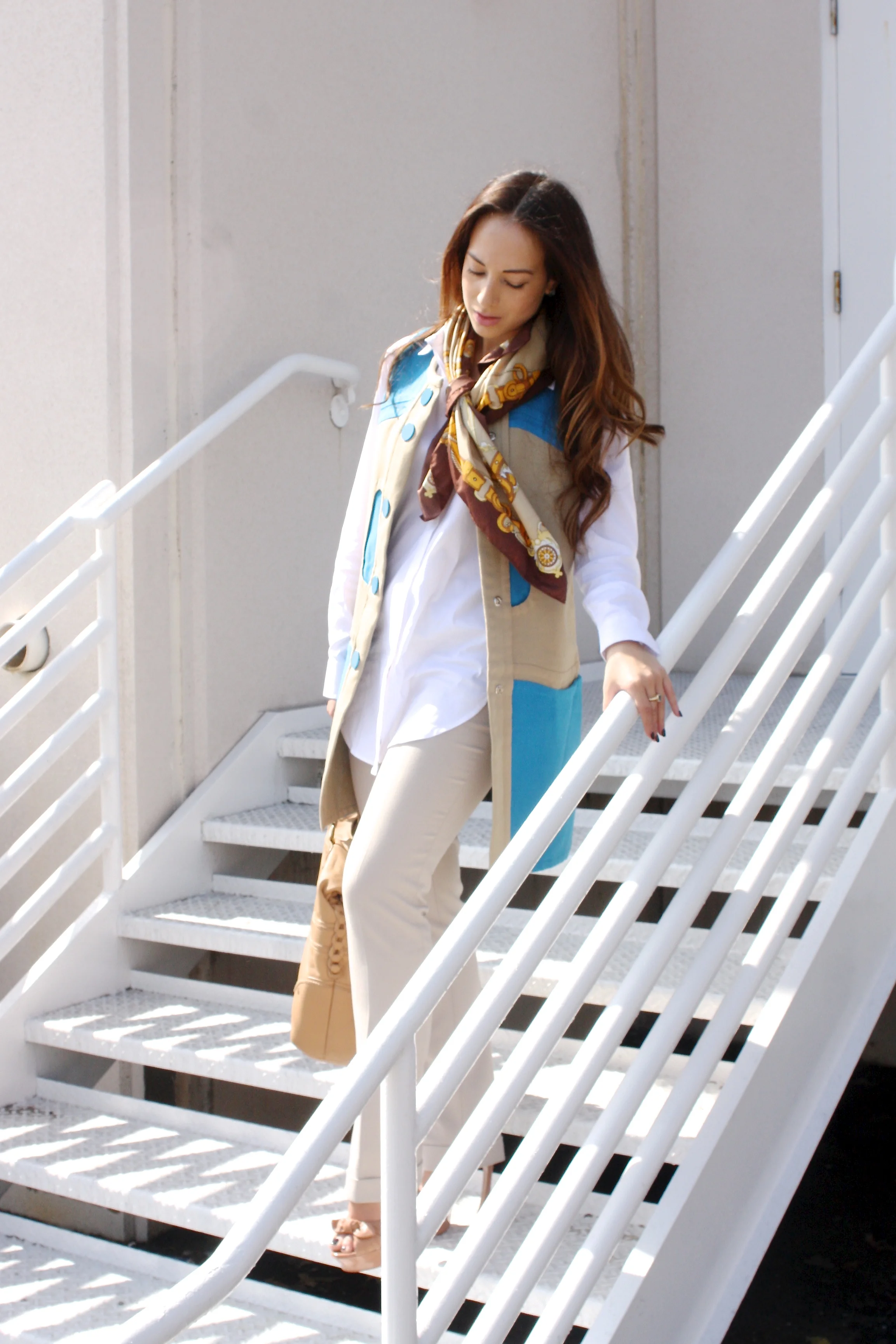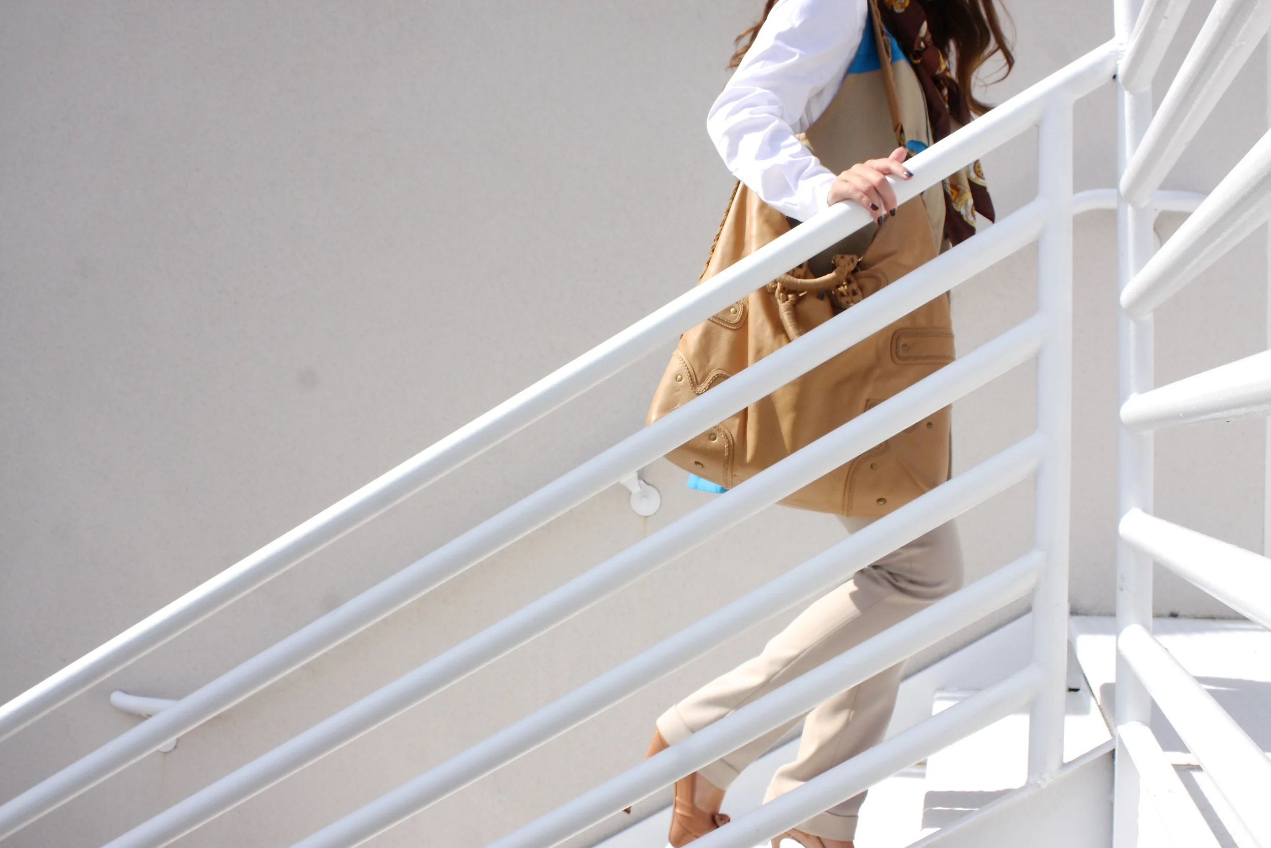 Coco wears a Marc Jacobs Camel Dress, Dries Van Noten White Collared Shirt, Zara Beige Trousers, Saint Laurent Patent Heels, Italian Camel Leather Bag.