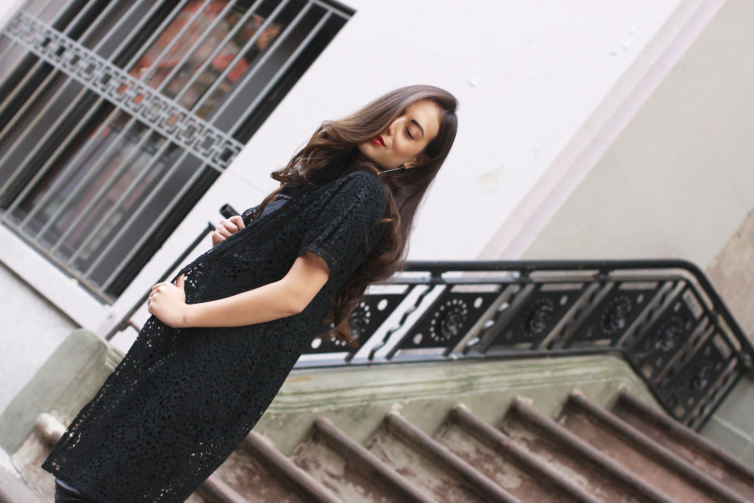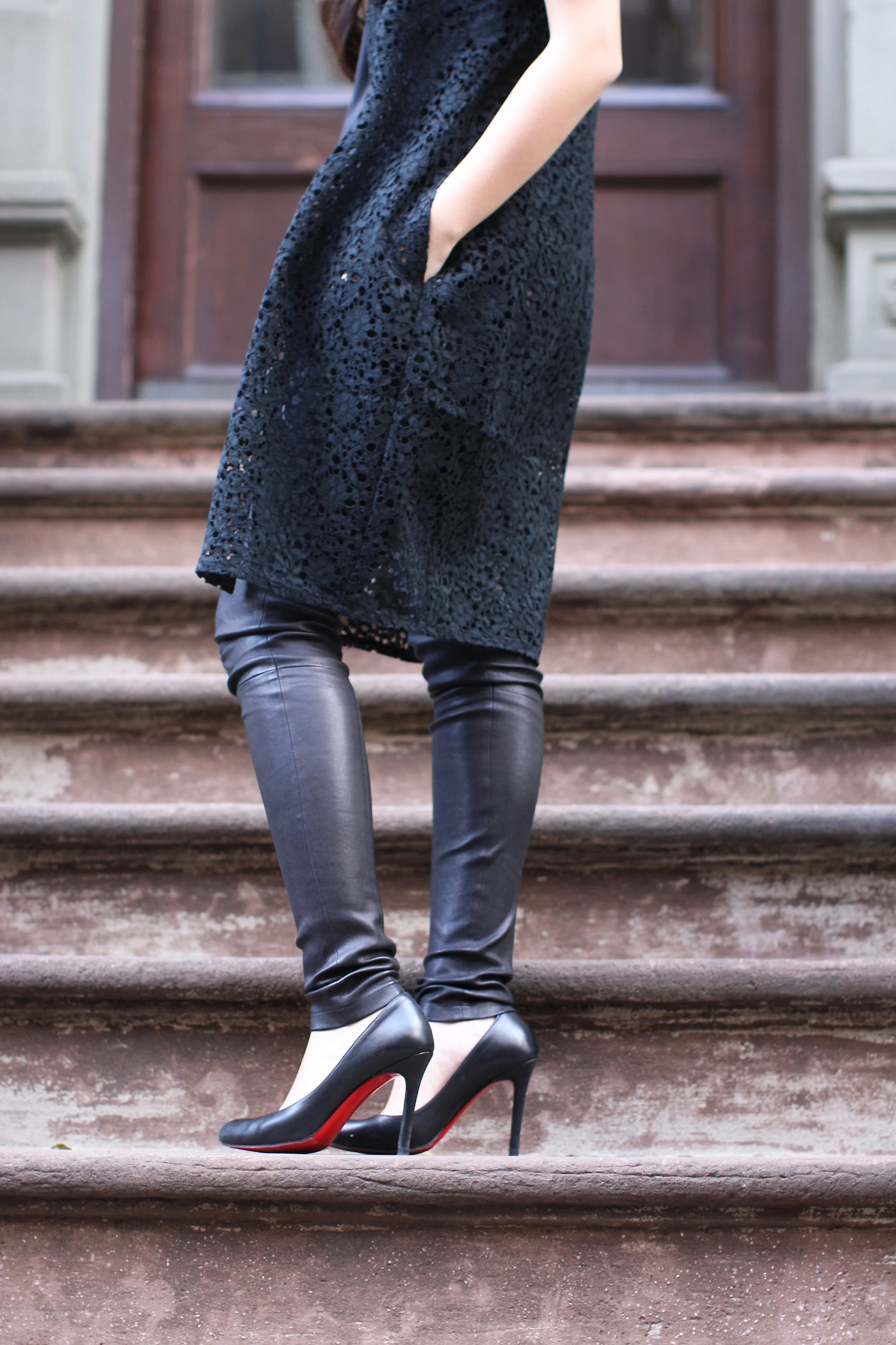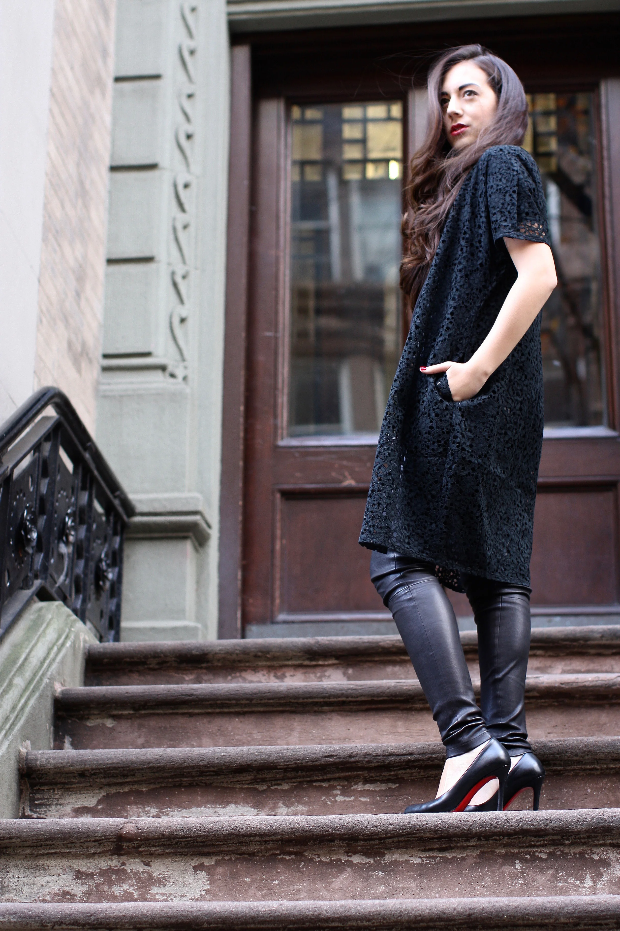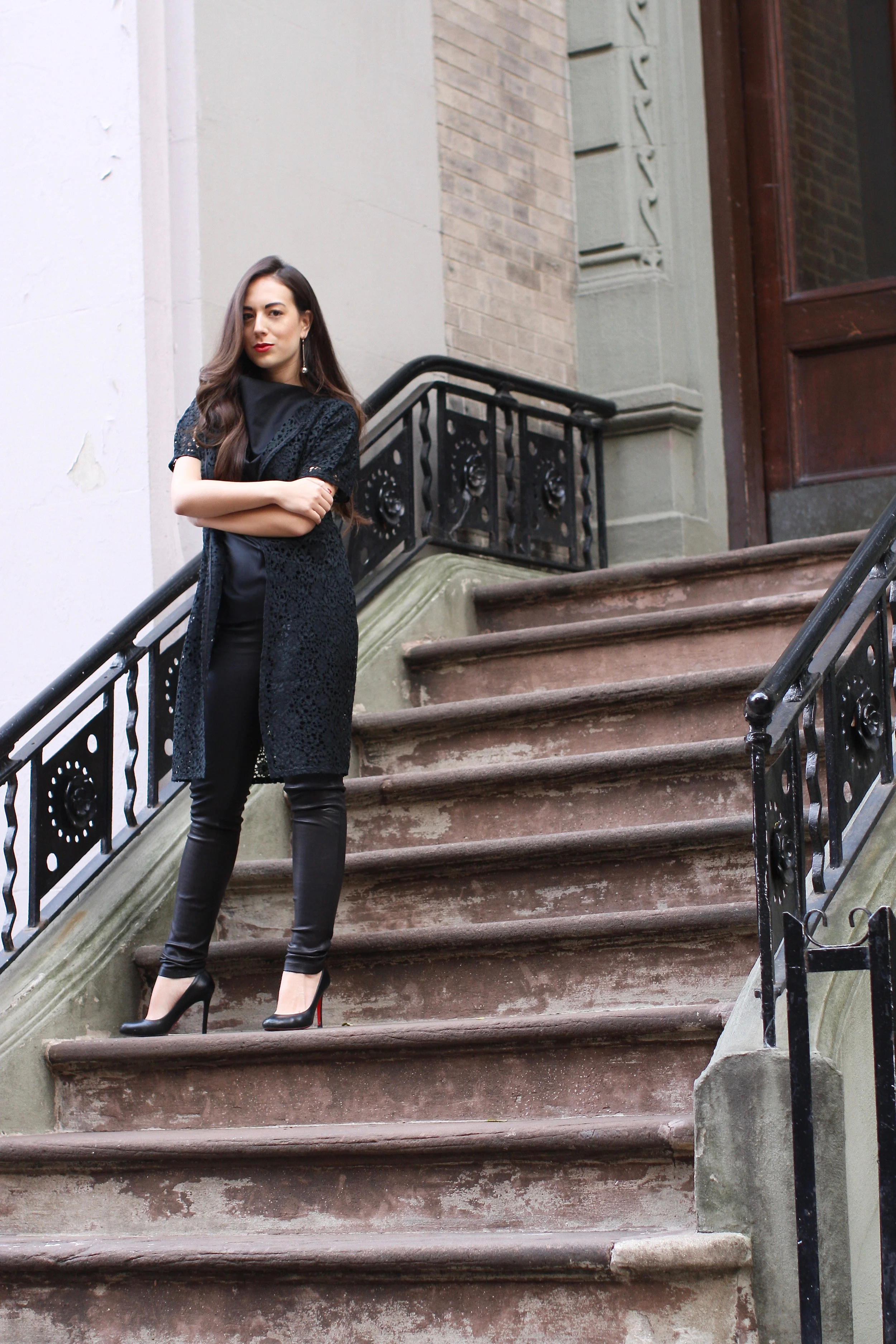 Coco wears a Vera Wang Lace Duster, J.W. Anderson Blouse (Moda Operandi), Theory Leather Leggings, Christian Louboutin Simple 100's.
