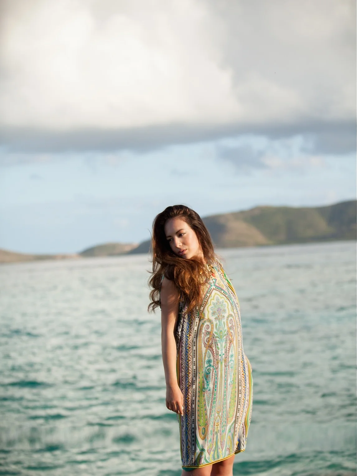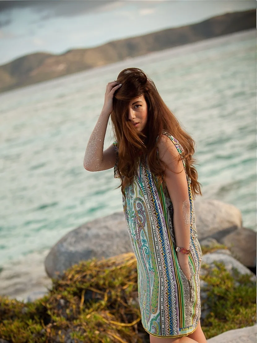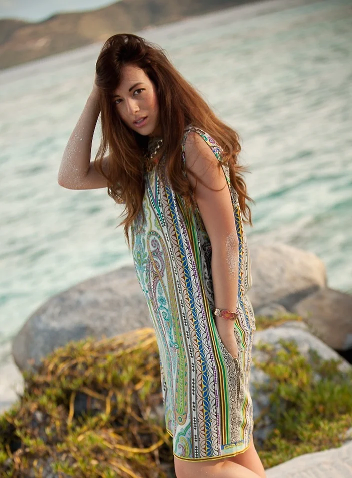 Coco wears an Etro Printed Dress and vintage jewelry. Moments captured on Necker Island by John Dill.