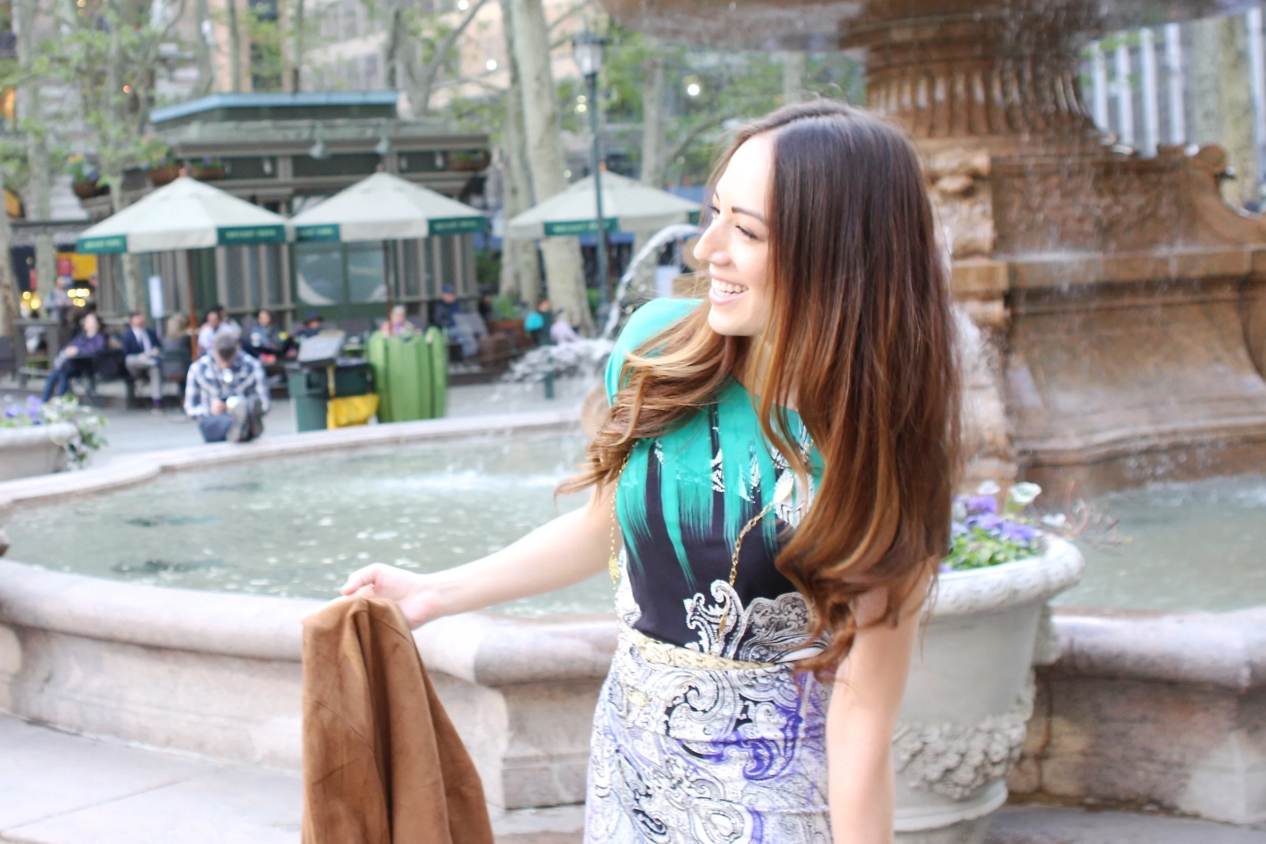 Coco wears an Etro Dress, Forever 21 Faux Suede Jacket, Saint Laurent Heels, vintage python belt, vintage gold necklace and a Prada Daino Top Handle Tote. Photography by Aditi Deeg in Bryant Park en route to dinner.