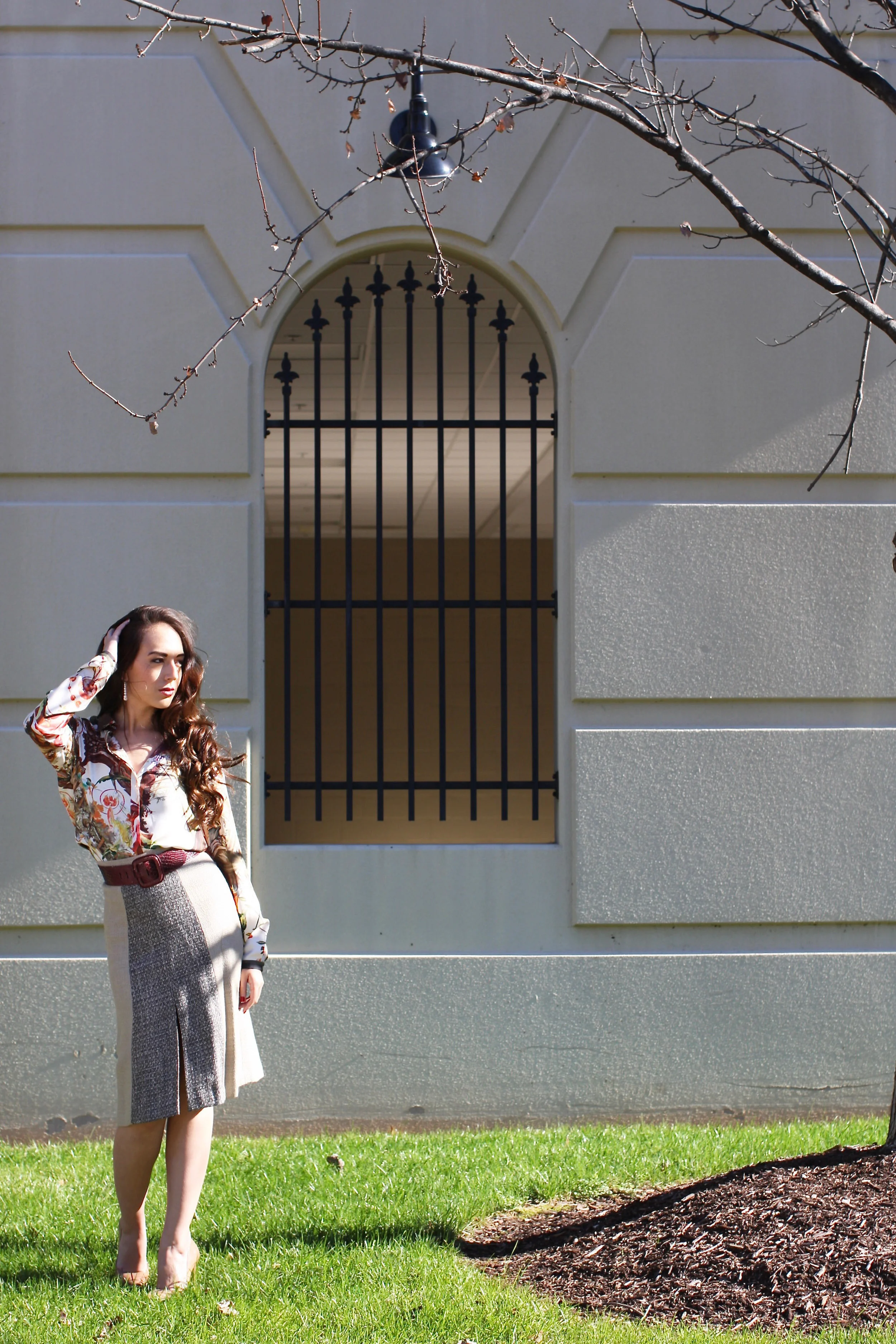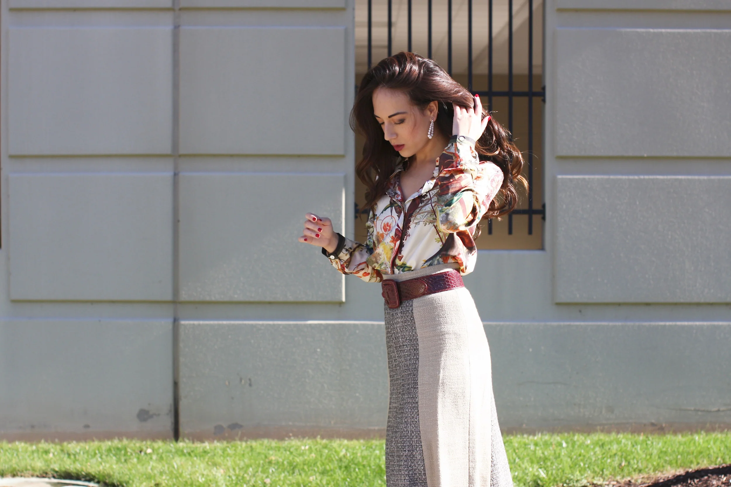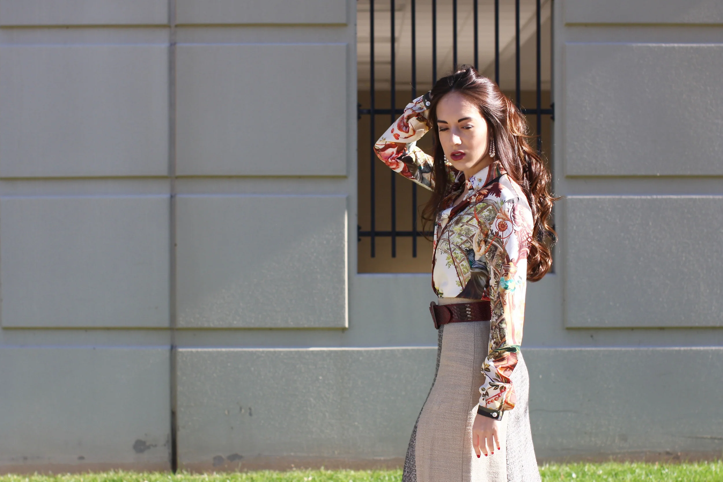 Coco wears an Etro Floral Silk Blouse, Etro Mixed-Media Tweed Skirt, Prada Patent Heels, Vintage YSL Python Belt. Photography by: Bethany Halbreich