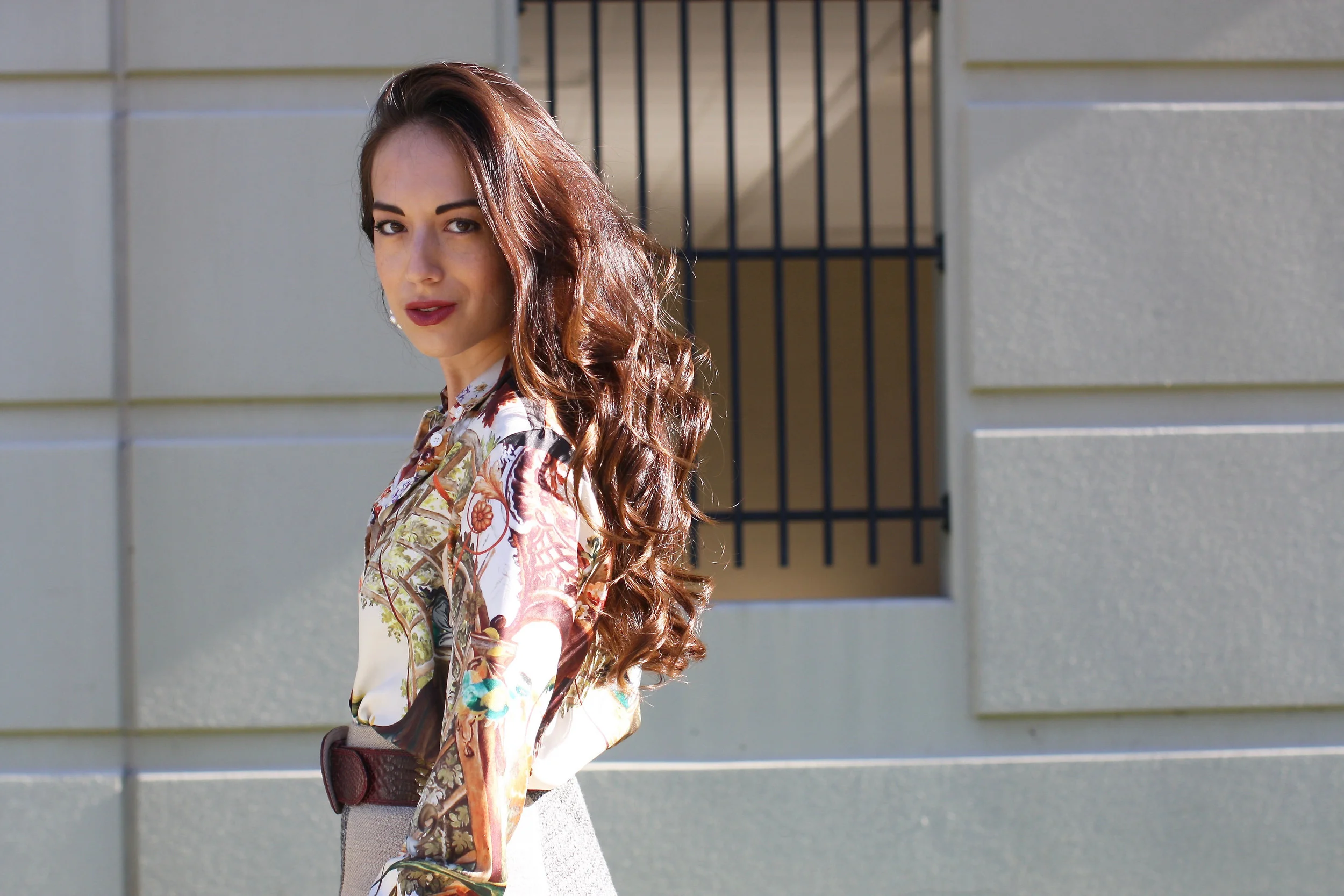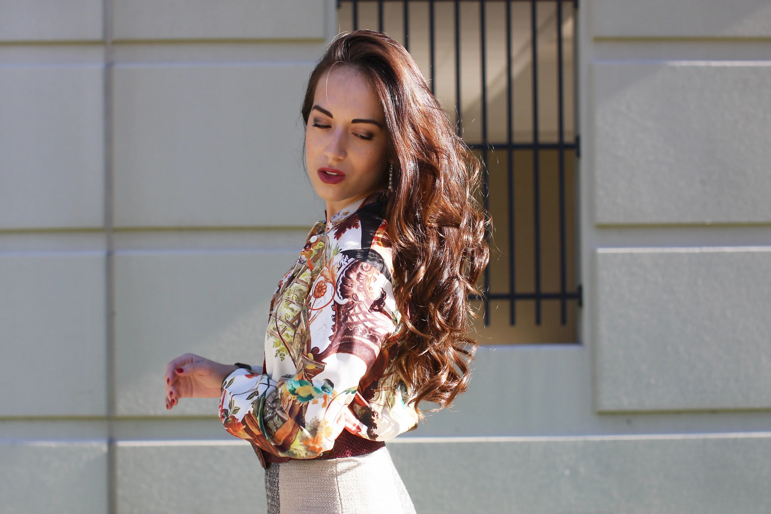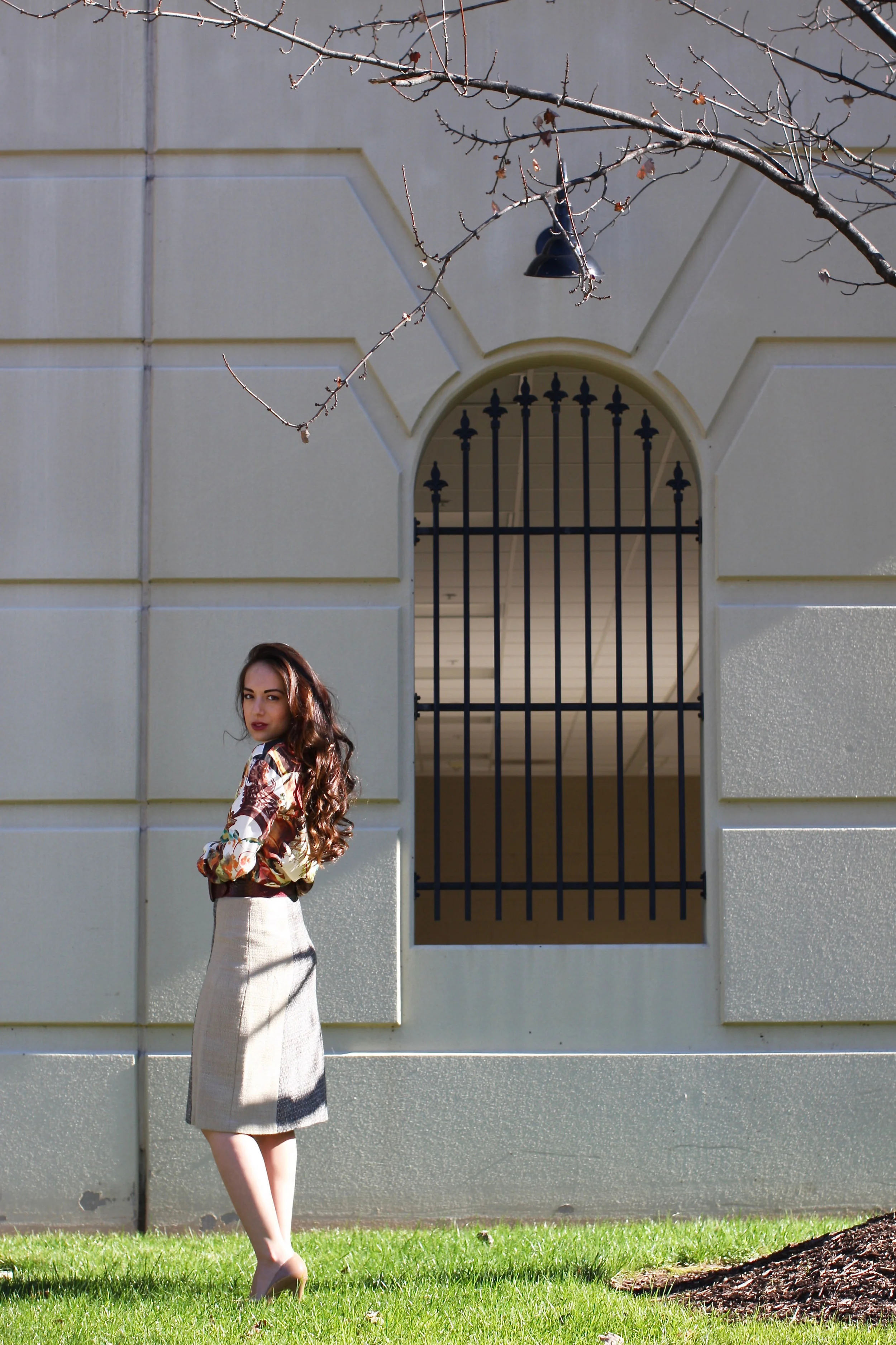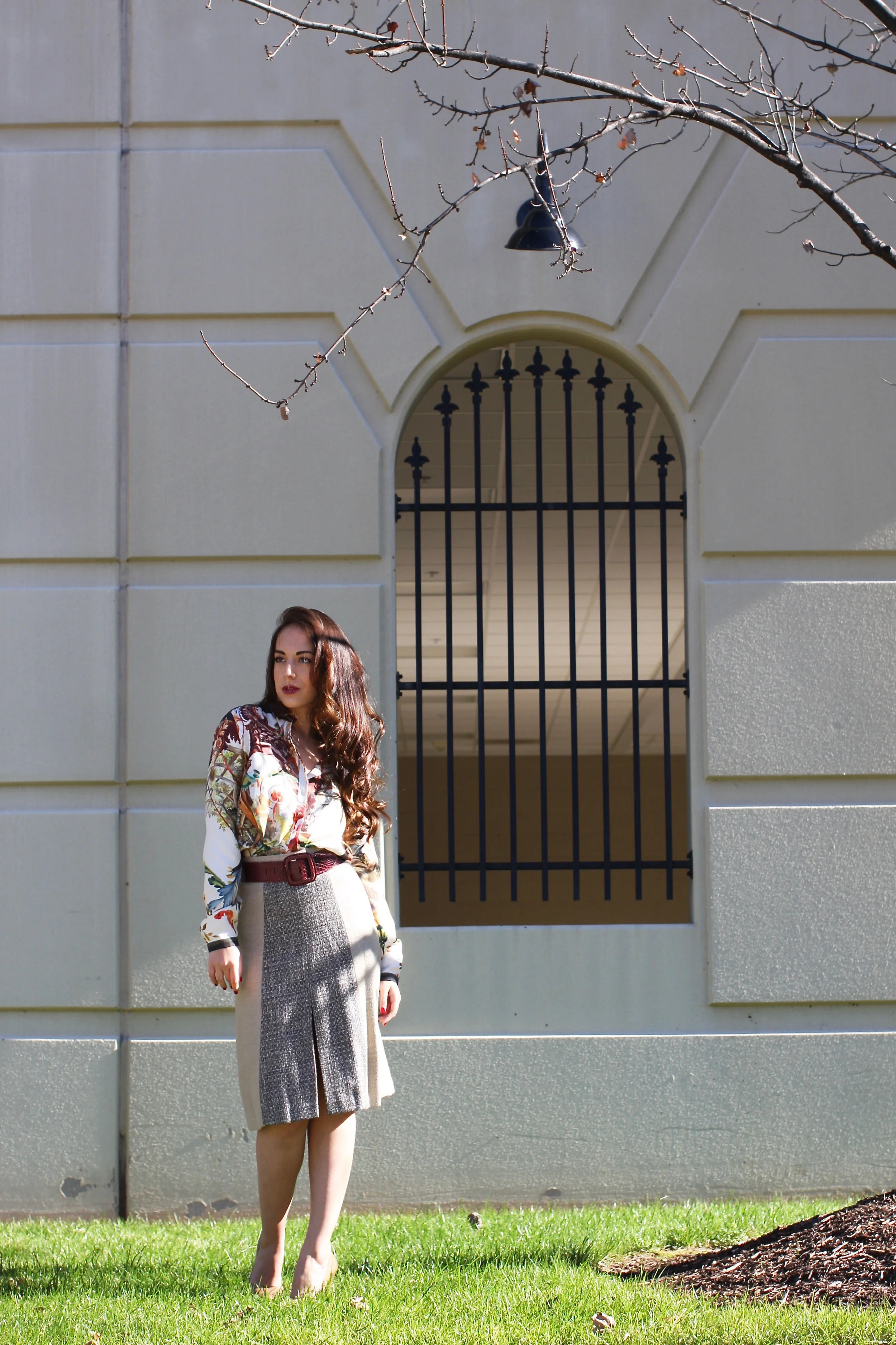 Coco wears an Etro Floral Silk Blouse, Etro Mixed-Media Tweed Skirt, Prada Patent Heels, Vintage YSL Python Belt. Photography by: Bethany Halbreich
