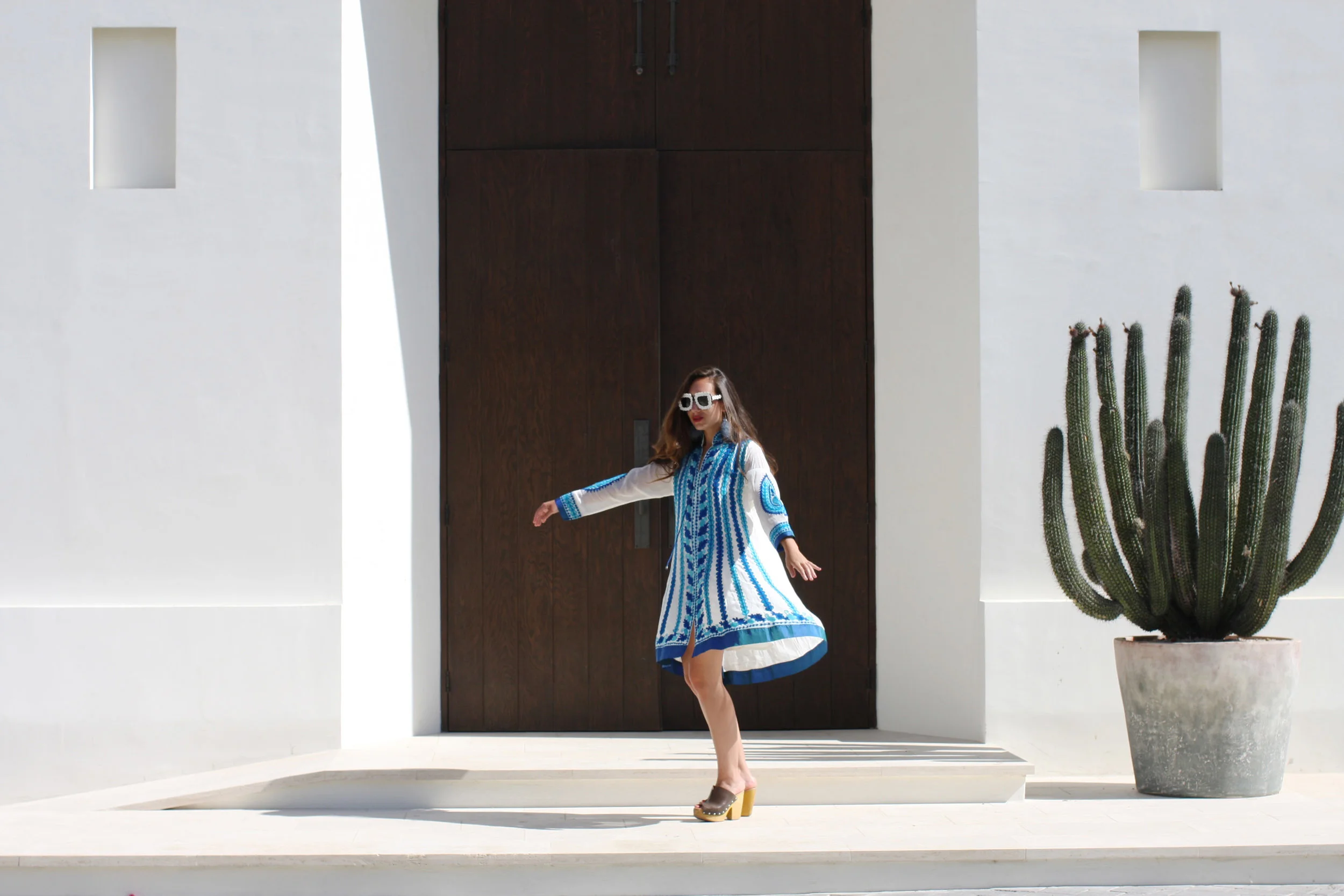 Coco wears: Vintage Silk Embroidered Dress, Vintage Wooden Wedges, Dolce & Gabbana Sunglasses. Photographer: Emily Diane. Location: Hotel San Cristóbal, Baja California Sur, Mexico. City Guide: Todos Santos. Playlist: Bonjour Tristesse.