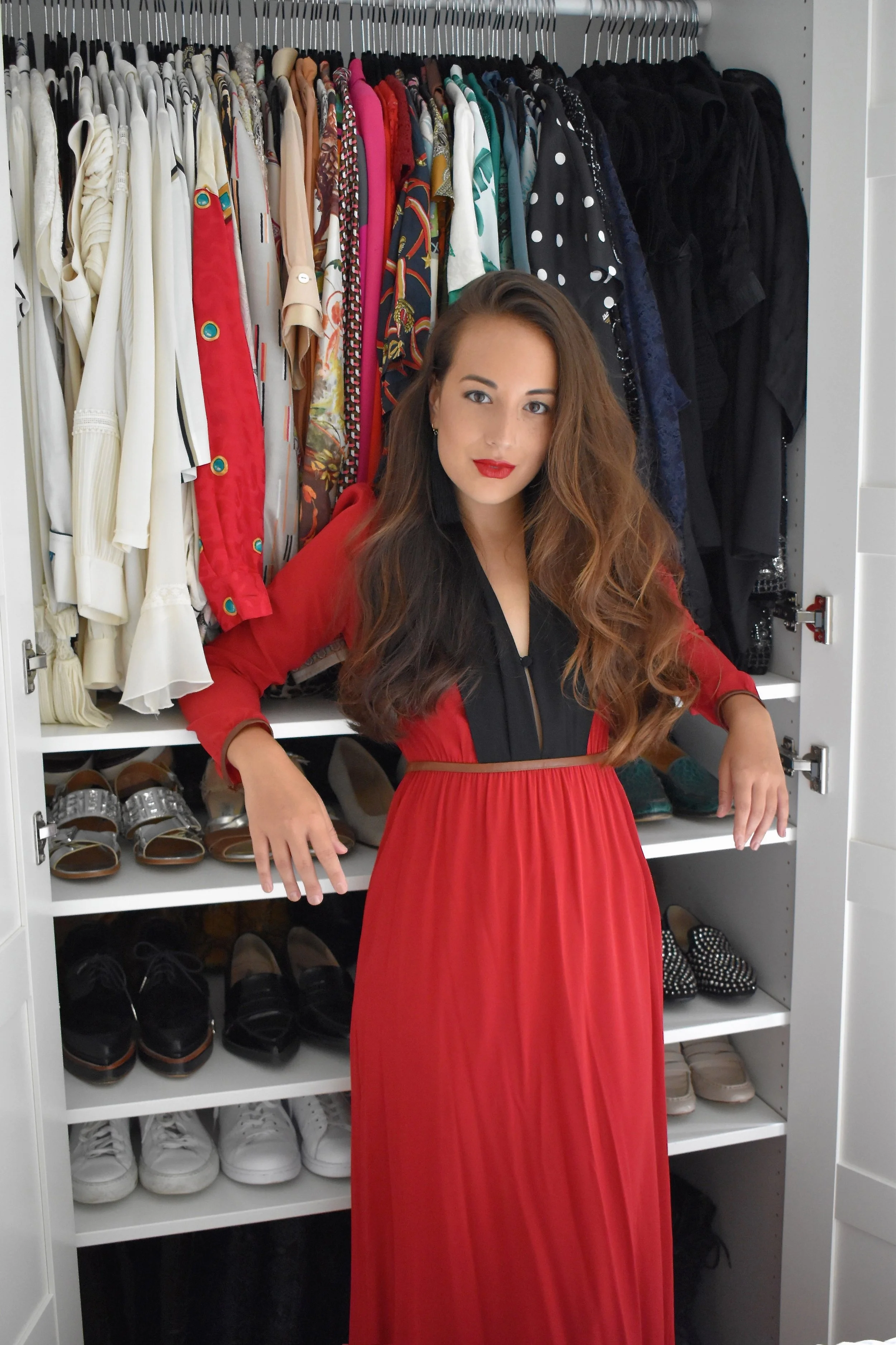 Coco Wears: Oscar de La Renta Ruffle Blouse, Vintage Navy Skirt, Patent Prada Platforms/ Red Silk Prada Dress/ Vintage Beaded Gown. Photographer: Dana Ferraro. Location: My home in Dumbo, Brooklyn. City Guide: Brooklyn.
