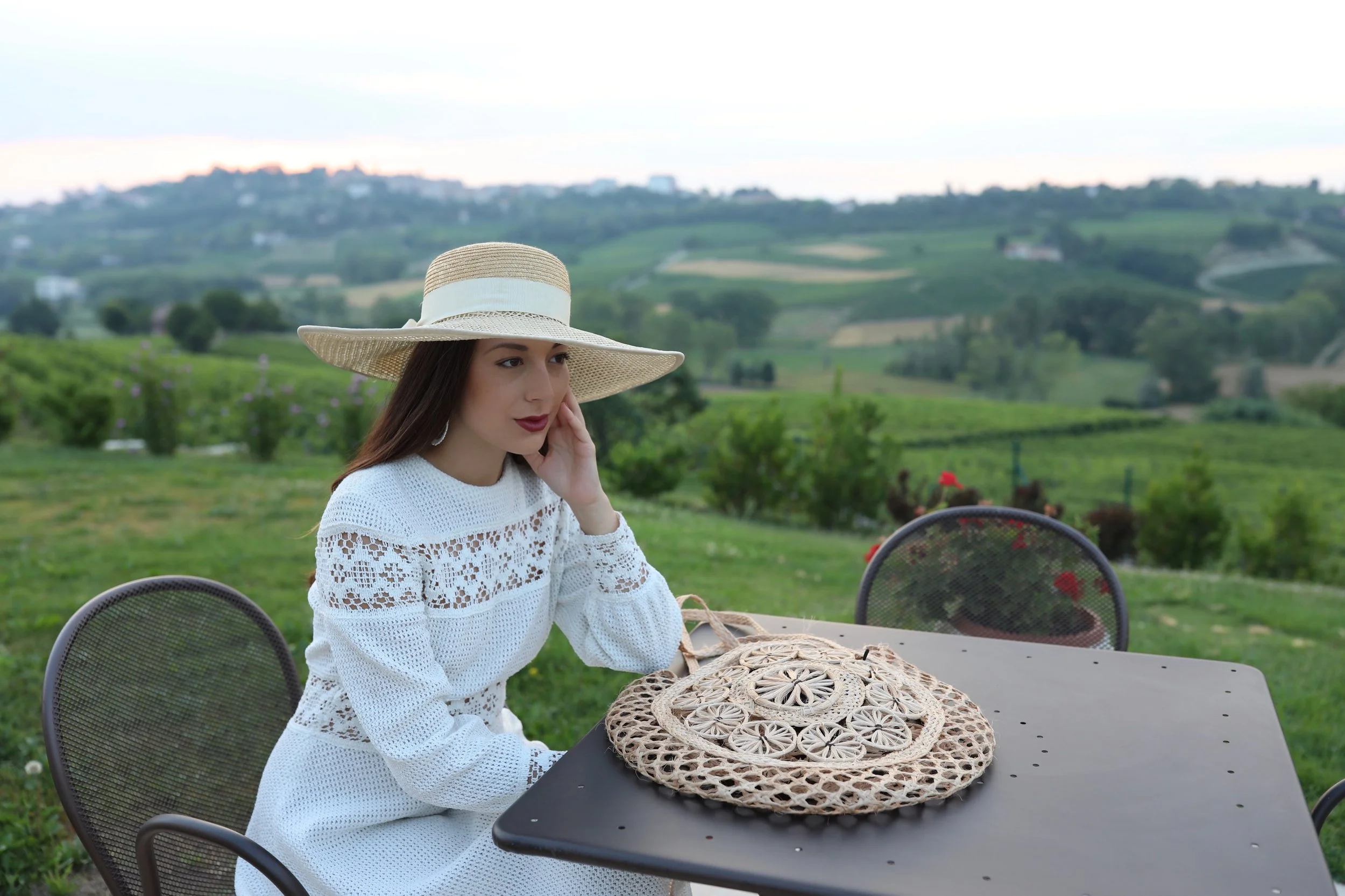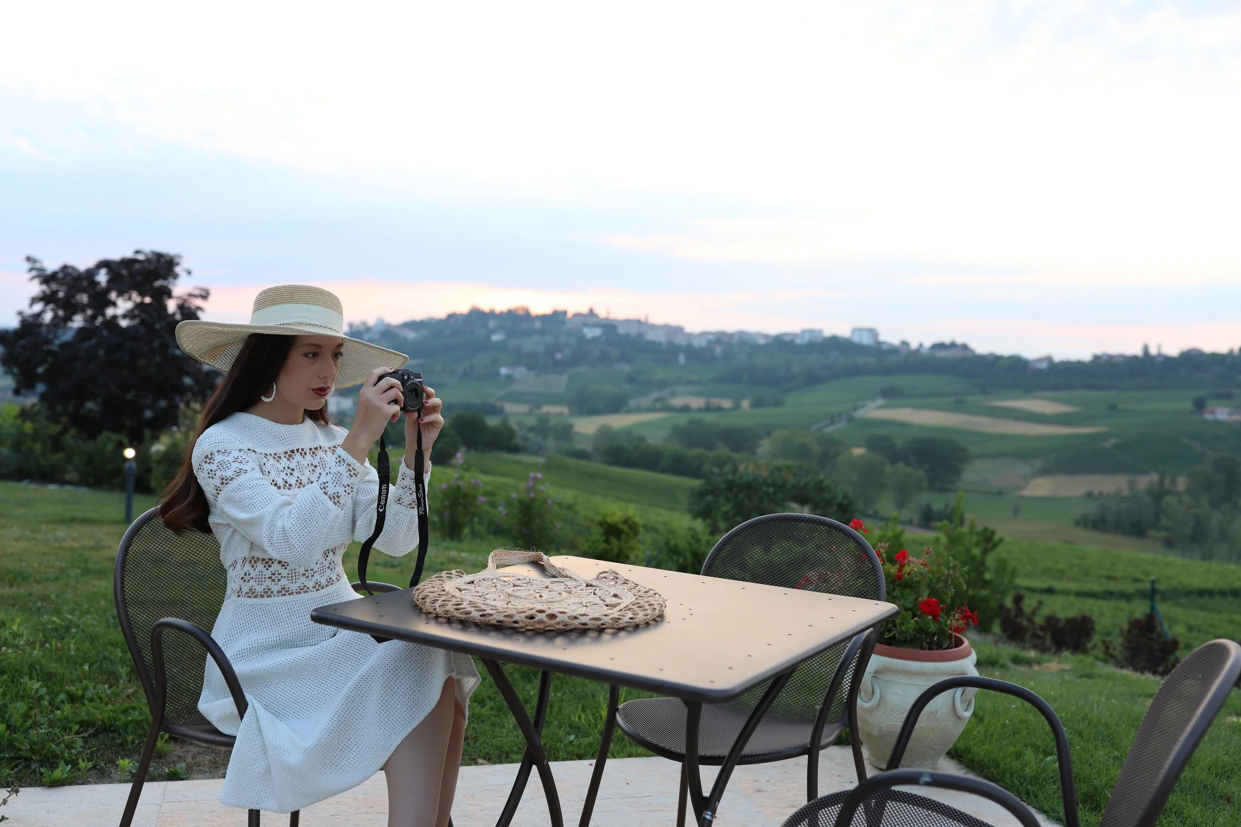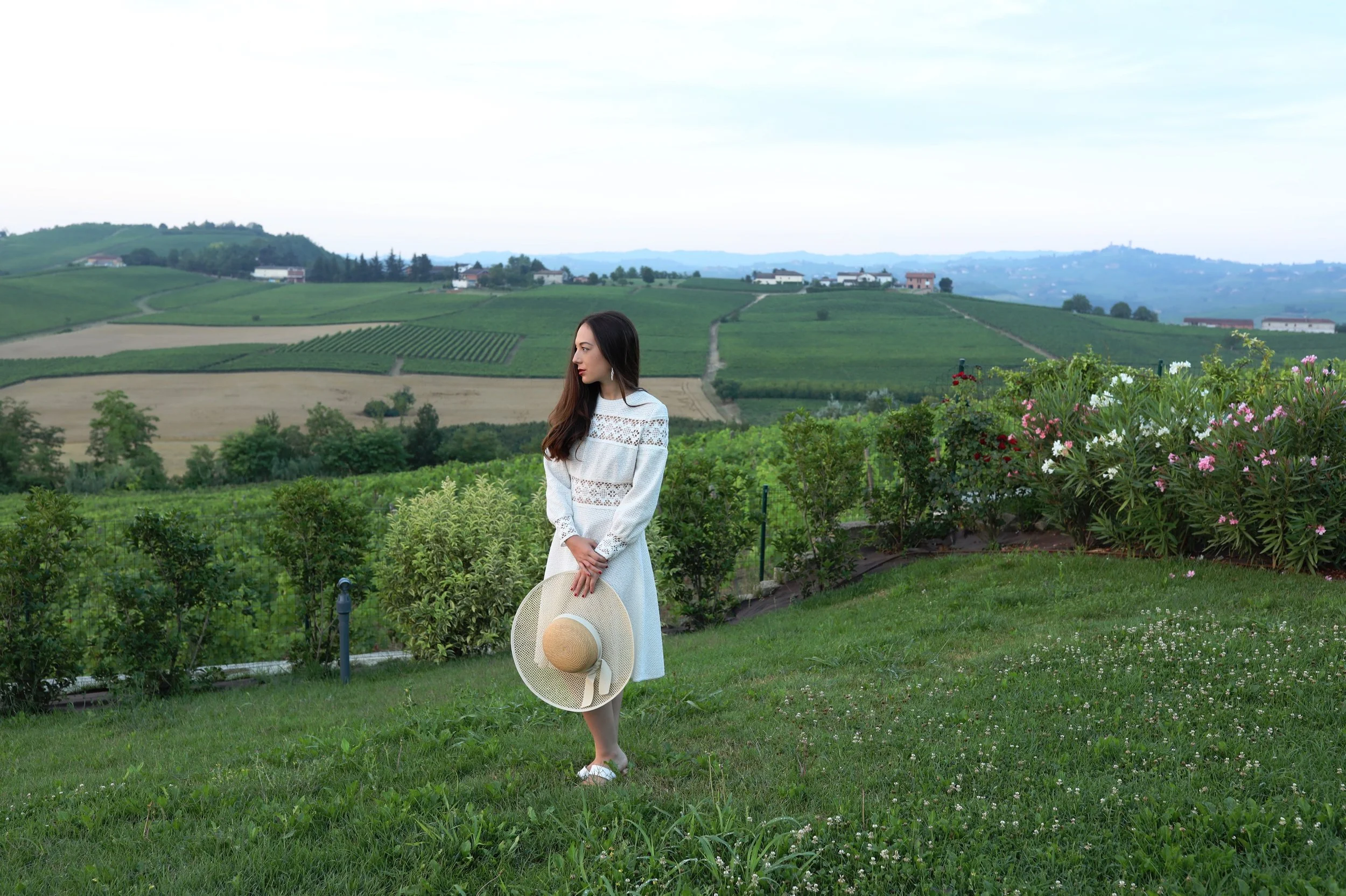 Coco Wears: Vintage knit and lace dress, Vintage hat, Vintage straw bag. Photography: Sarah Son. Location: NaturalMente Wine Resort, Agliano Terme, Province of Asti, Piedmont Countryside, Italy.