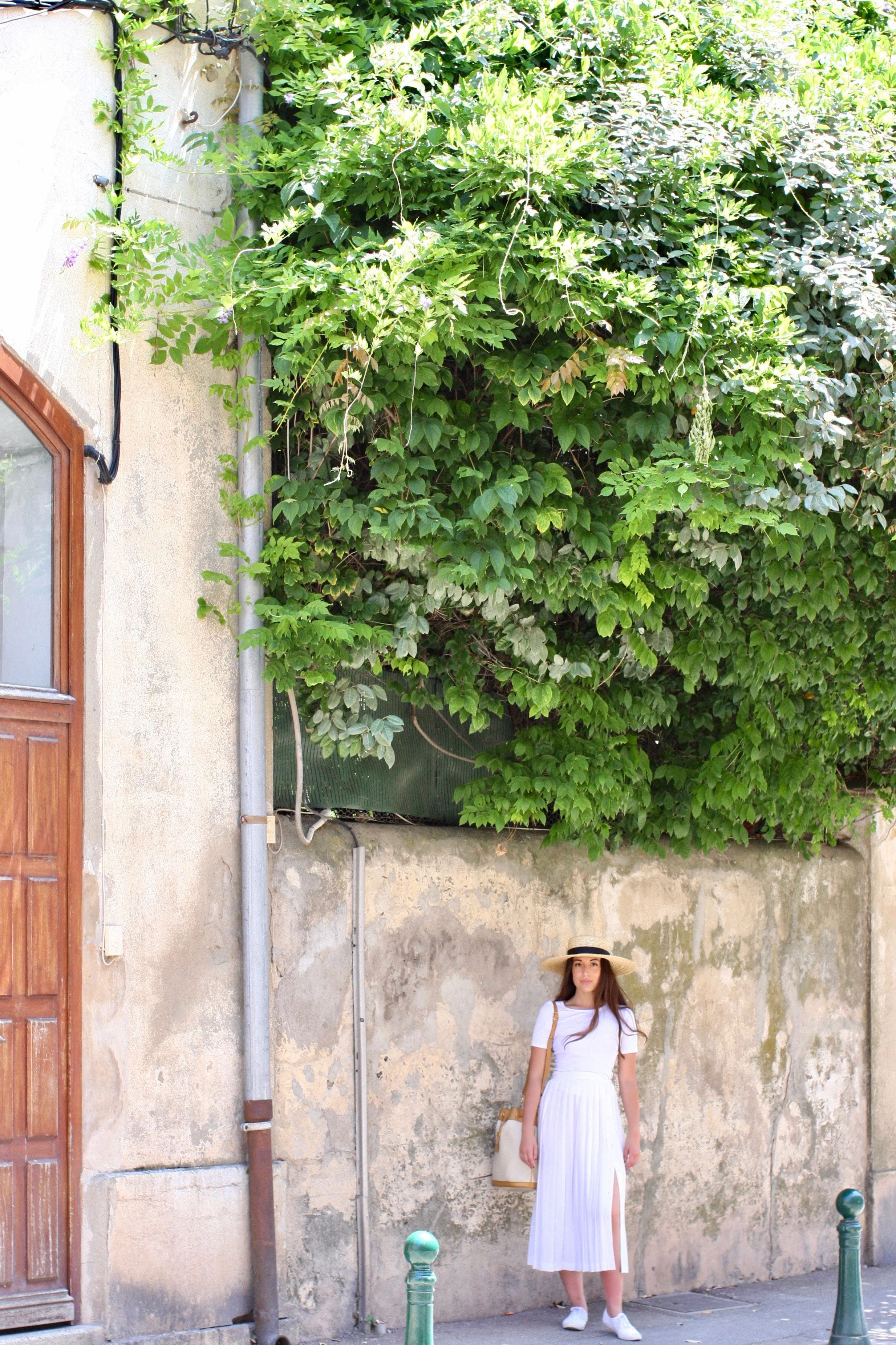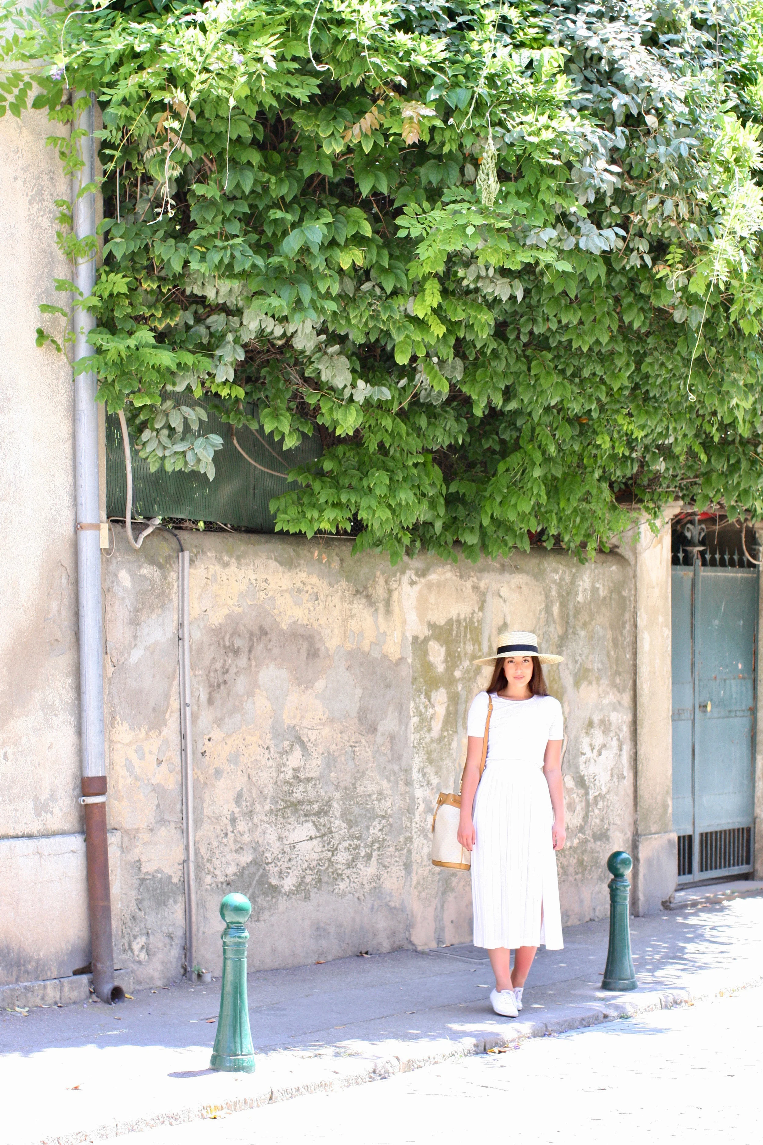 Coco wears: Everlane Tee-shirt, Vintage Linen Skirt, Ked's Tennis Shoes, Vintage Gucci Bucket Bag. Photographer: Emily Collins. Location: Saint-Tropez, France. City Guide: Saint-Tropez
